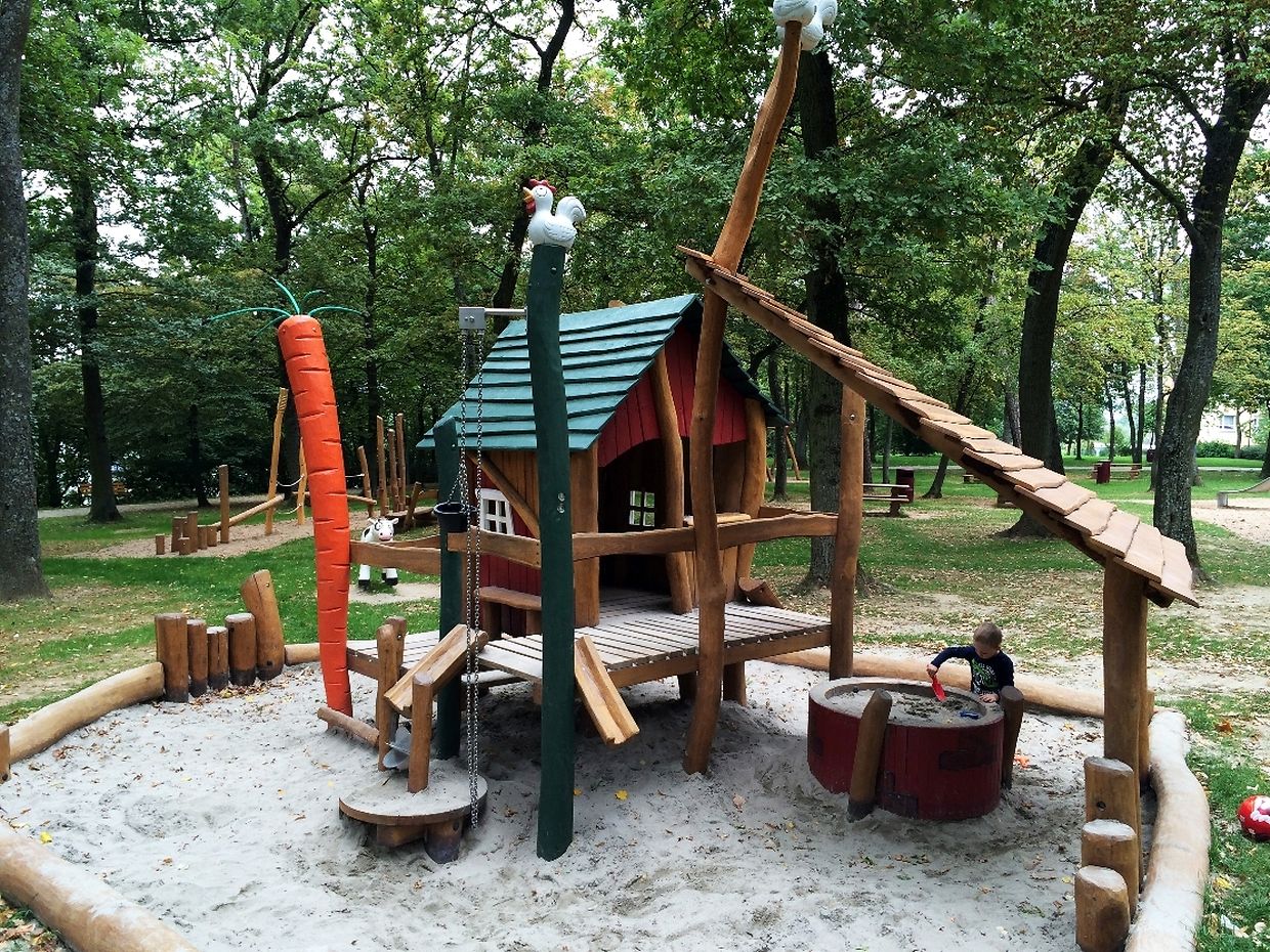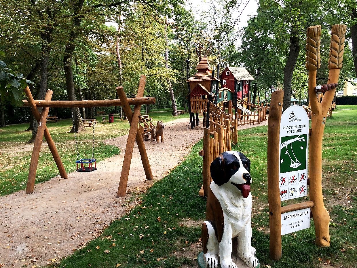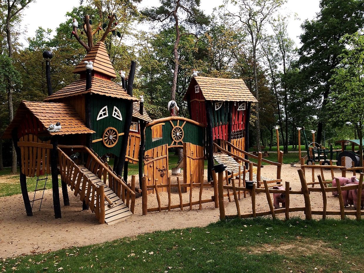 Des Spillplaz ass komplett aus Holz a mat Rutschbahn, Sandkaul, Schaukel a Klettergerüst ass alles do wat e Kand brauch fir e schéine Spillnomëtteg ze verbréngen.