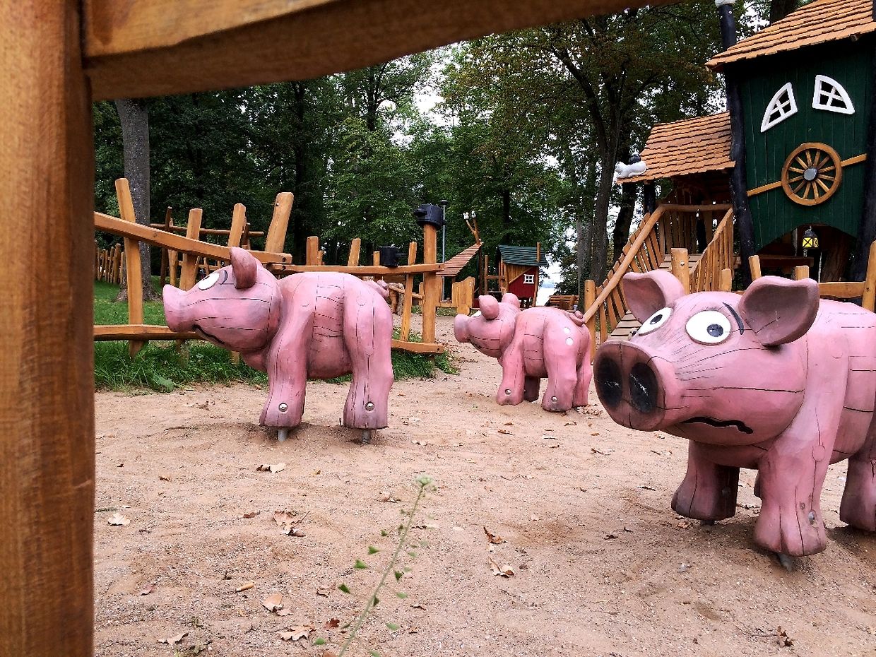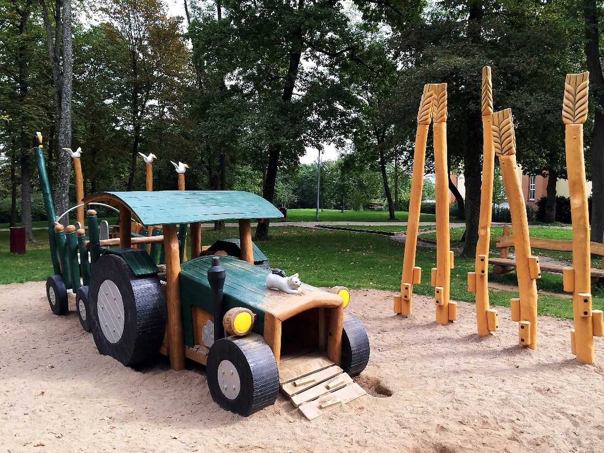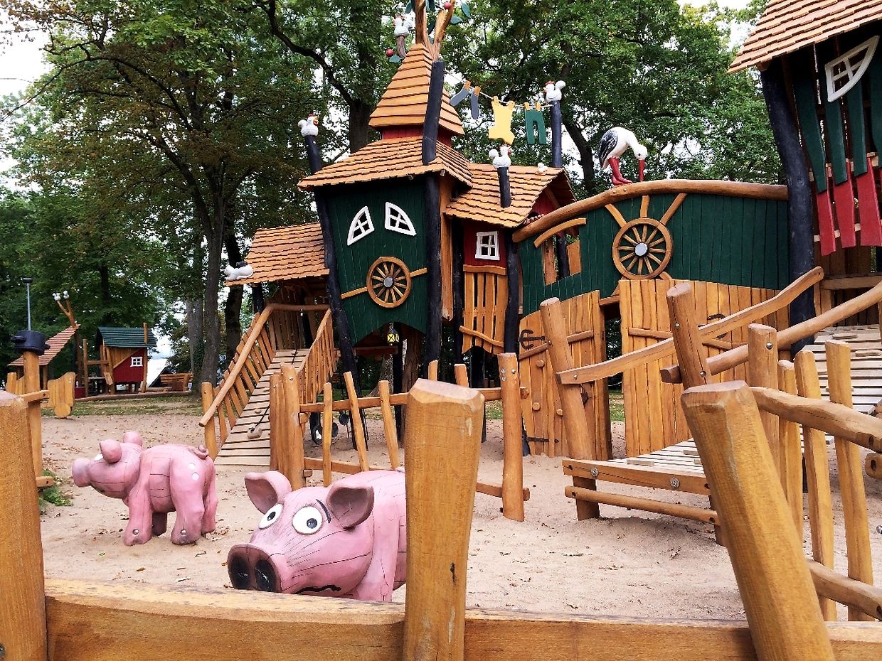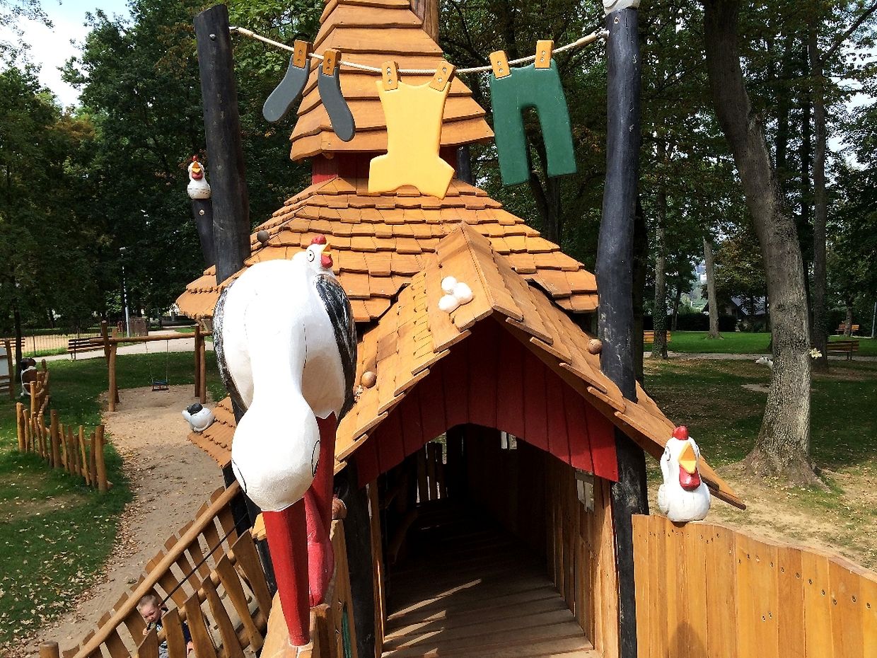 Des Spillplaz ass komplett aus Holz a mat Rutschbahn, Sandkaul, Schaukel a Klettergerüst ass alles do wat e Kand brauch fir e schéine Spillnomëtteg ze verbréngen.