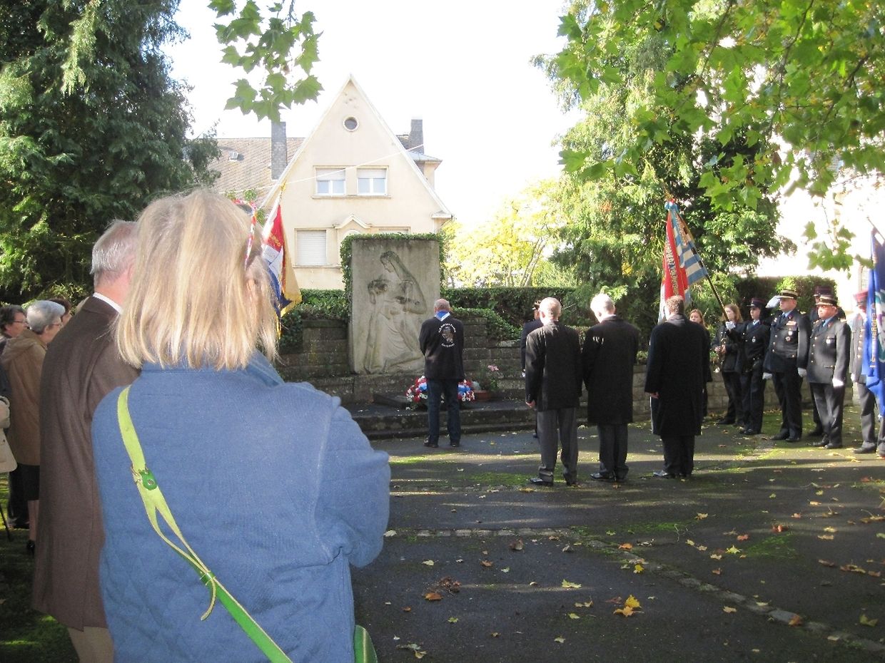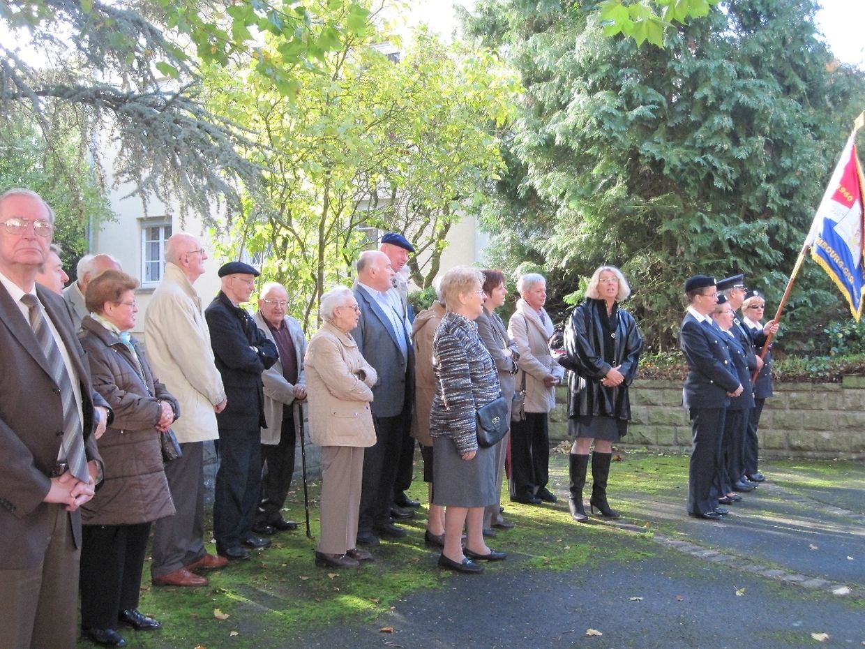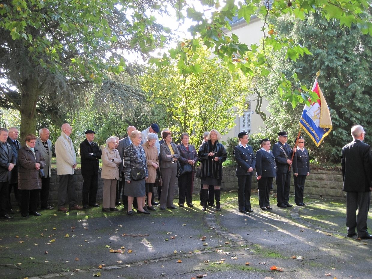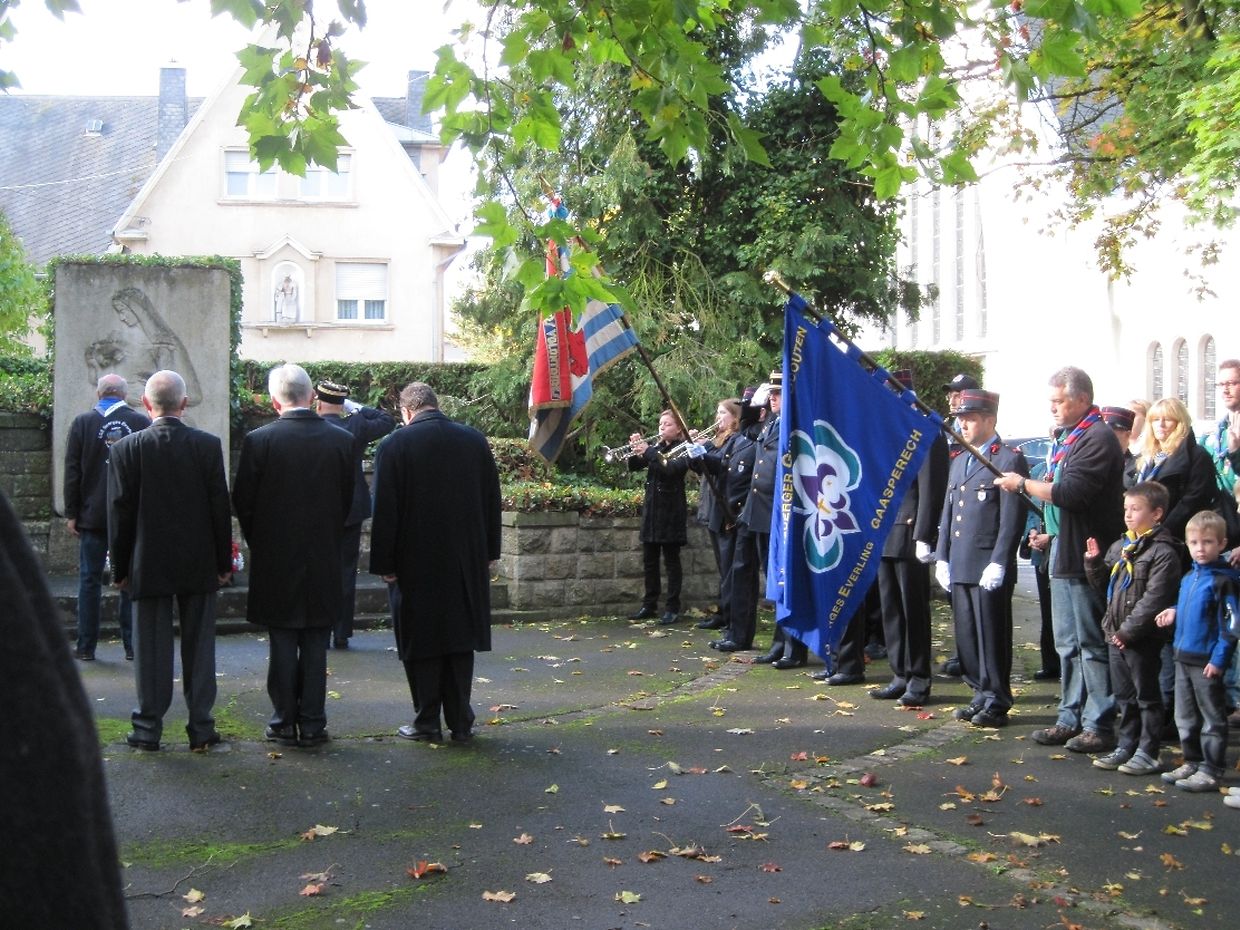 Zur Erinnerung an den Kampf des Luxemburger Volkes während der Besetzung des Landes durch die Nazioppressoren hatte der Interessenverein aus Gasperich am vergangenen 07. Oktober zu den Feierlichkeiten des Nationalen Gedenktages eingeladen. Lokale Vereinigungen sowie Vertreter der Freiwilligen Feuerwehr Luxemburg-Zentrum waren dem Aufruf zum Gedenken an den 10. Oktober 1941, wo das Luxemburger Volk durch ein Referendum seinen Willen und seine Entschlossenheit äusserte, sich von der Nazi-Diktatur zu befreien, gefolgt. Im Anschluss an die religiöse Feier welche zelebriert wurde von Abbé Jean Hierzig, versammelten sich die Vereine sowie Anwohner des Viertels vor dem „Monument aux Morts, wo ein Blumengebinde zur Erinnerung an die für unsere Heimat Gefallenen niedergelegt wurde. Nachdem die Sonnerie aux Morts, gespielt von Anne Duchscher und Christina Meyer verklungen war, stimmte der Kirchenchor unter der Leitung von Mme Sylvie Zuccoli die „Heemecht“ an und die Anwesenden schlossen sich im Andenken an die Frauen und Männer die Verfolgung und Zertrümmerung miterlebt haben, an. Dann lud François Dahm, Präsident des lokalen Interessenvereines ins Home St Joseph ein, um im gemütlichen Beisammensein den Sonntagmorgen ausklingen zu lassen. Bei dieser Gelegenheit wurden Marc Mamer, Roberto Scolati sowie Patrick Steffes Medaillen für langjährige Verdienste im Feuerwehrwesen verliehen. jl - Fotos : Jacquie Lakaff