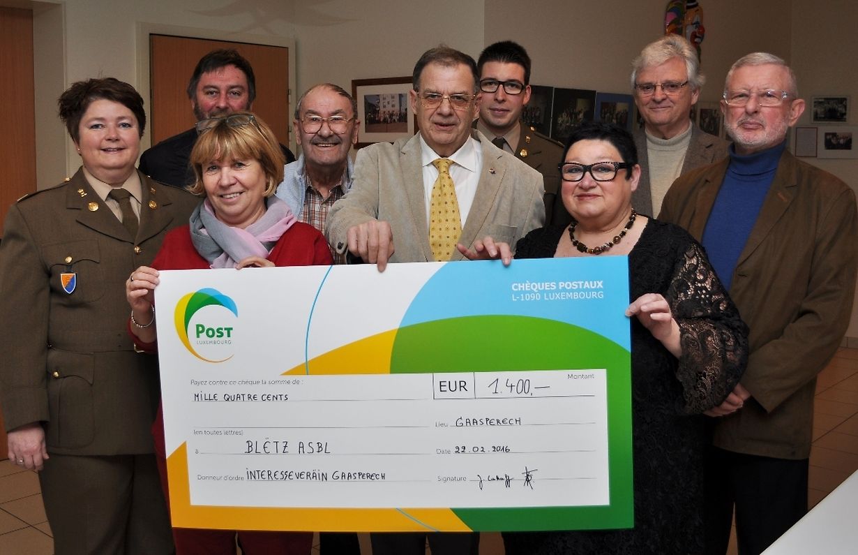 Vor einigen Tagen überreichten Präsident François Dahm, Pierre Block, Jacquie Lakaff, Eugène Lanners und Léon Ury des Interessenvereines Gasperich begleitet von AdjMaj Monique Bernotte und 1er Sgt Pit Keller der Grossherzoglichen Militärkapelle eine Spende von 1400.- € an Karin Magar von der asbl Blëtz.