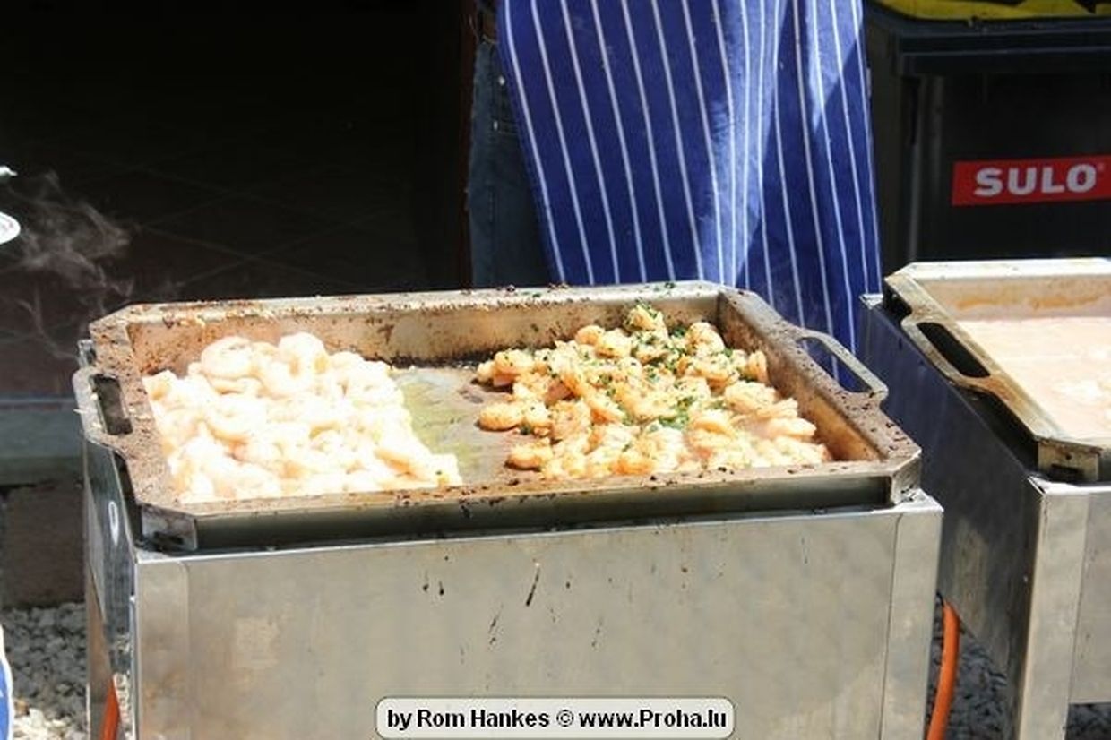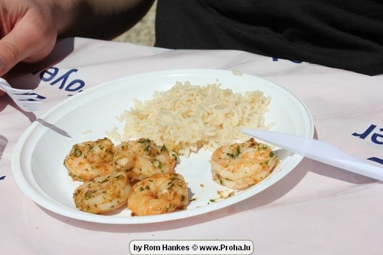 Ravi 3: Scampi´en mat vill Knueweleck an Reis mat 1 Glas Pinot Blanc.