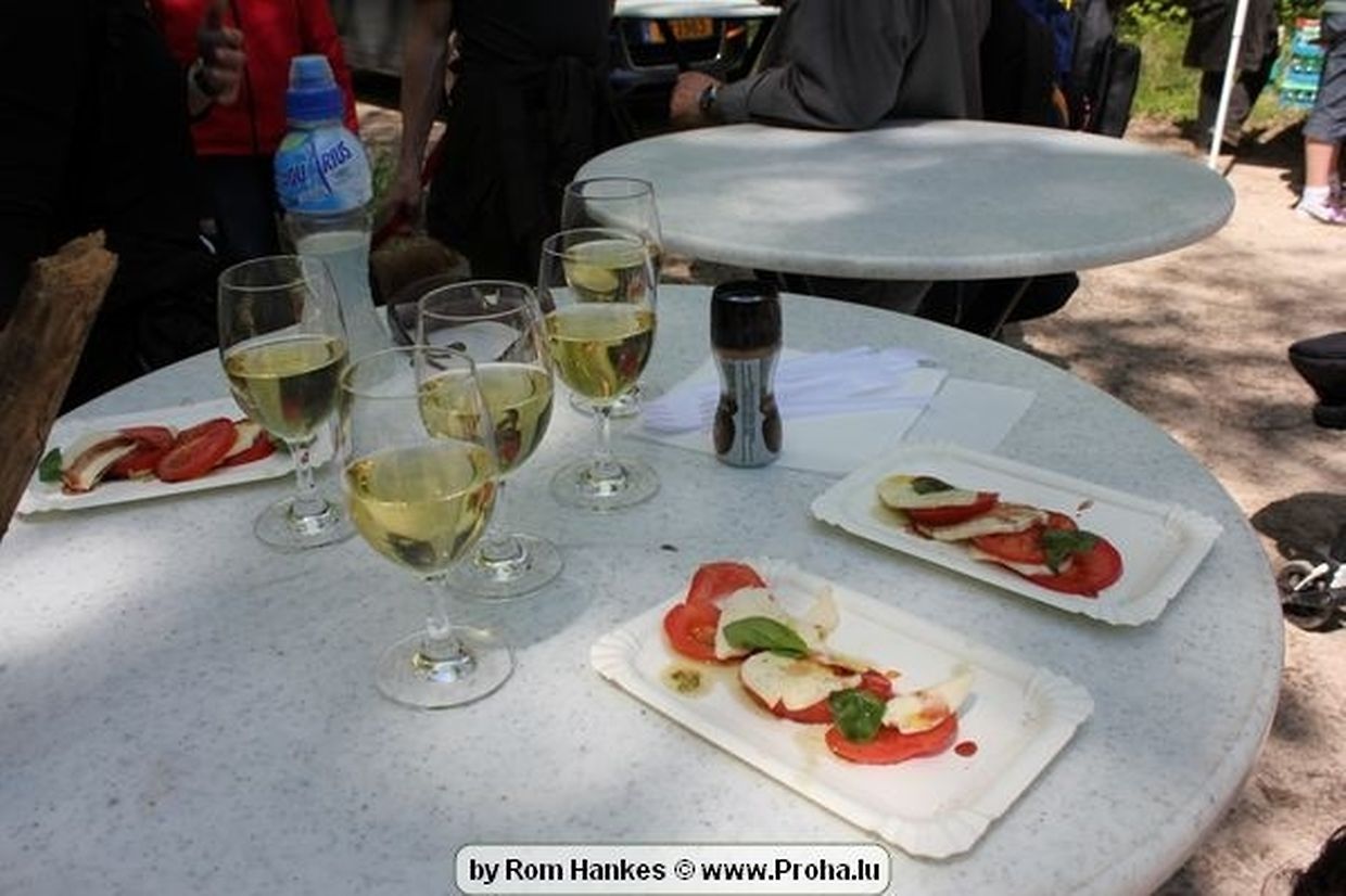 Bierg op Richtung Ravi 2 goung et wieder. Am Bösch kruten mir dun Tomates Mozarella mat 1 Glas Chardonnay.