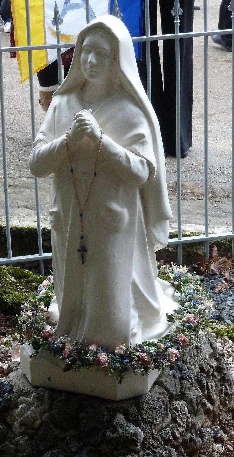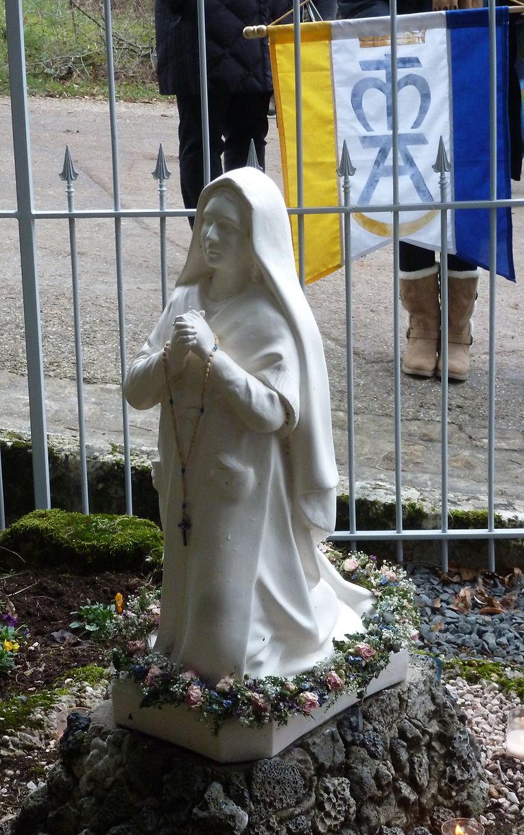 Wir versammeln uns heute am 11. Februar 2023 hier in Girsterklaus , am Jahrestag der ersten Erscheinung der seligen Jungfrau Maria, im Jahr 1868 bei der vierzehnjährigen Bernadette Soubirous in der kleinen Stadt Lourdes, die im Vorgebirge der Pyrenäen in Südfrankreich liegt. Eben deshalb war dieser Jahrestag ausgewählt worden, zur Segnung der neuen Bernadette Statue, welche hier vor der Lourdes-Grotte im Laufe des Jahres 2022 aufgestellt wurde. Vor der Grotte stehend betrachten wir die Schönheit der neuen Bernadette Statue und hören den sorgfältig ausgewählten Worten vom Abbé Luc Schreiner zu.