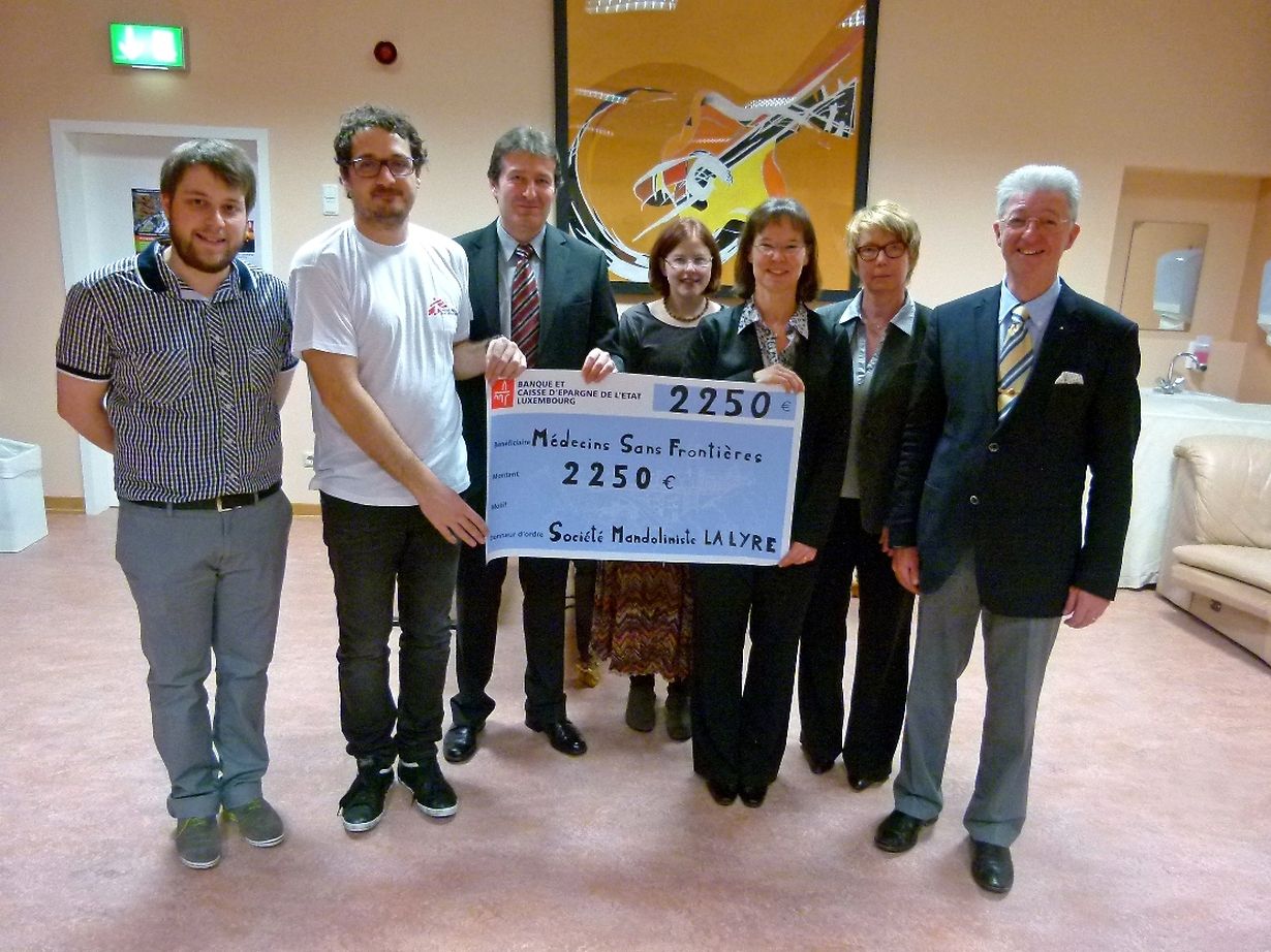 Die beiden Spendensammlungen am Ende der Konzerte ergaben die Summe von 2.250 Euro, die kürzlich an Michaël Dionisi, Vertreter der Organisation « Médecins Sans Frontières », von der Präsidentin des Mandolinenvereins, Isabelle Merlevede, überreicht wurden. Isabelle Merlevede dankte allen, die zum Erfolg der Konzerte beigetragen hatten, besonders aber den edlen Spendern, die sich in den Dienst einer guten Sache stellten. Michaël Dionisi seinerseits dankte den Mitgliedern des Vereins für diese edle Geste und hob hervor, dass die großzügige Spende für ihre Projekte im Entwicklungsland Niger dringend benötigt werde, wo, neben andern Aktivitäten, pro Jahr von MSF mehr als 60.000 Kinder, die an Unterernährung leiden, versorgt und behandelt werden