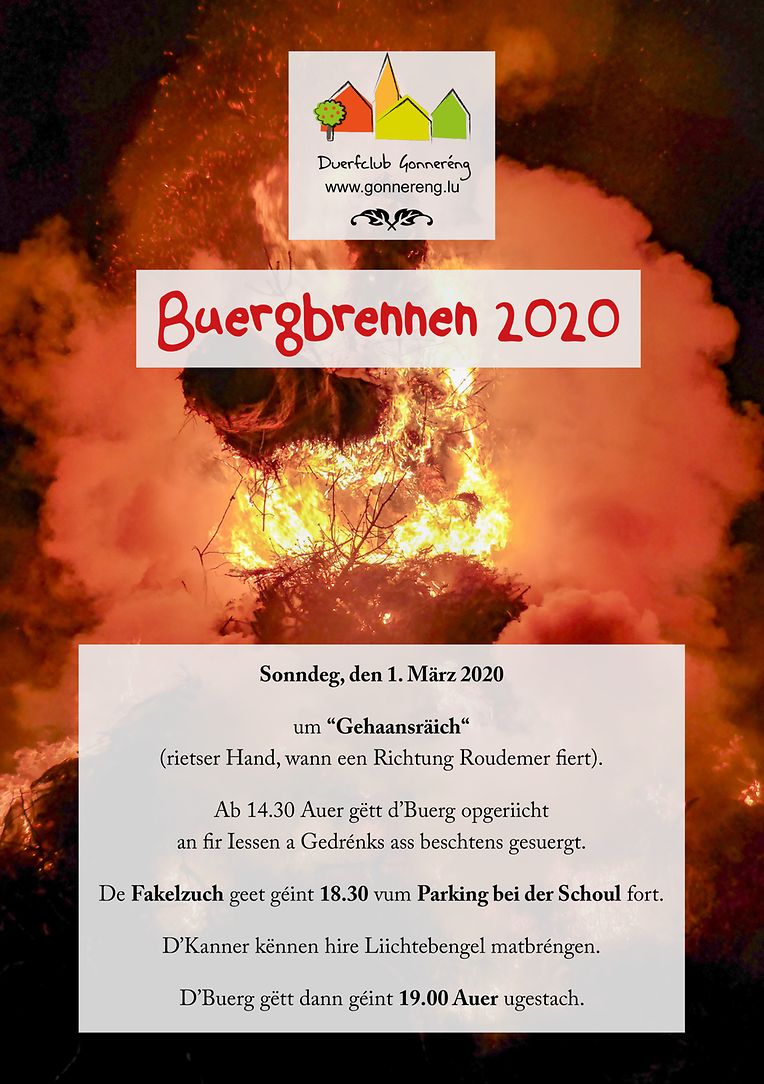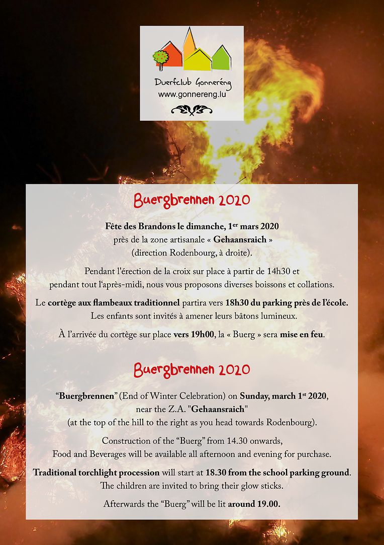 “Buergbrennen” (End of Winter Celebration) on Sunday, march 1st 2020, near the Z.A. "Gehaansraich" (at the top of the hill to the right as you head towards Rodenbourg).