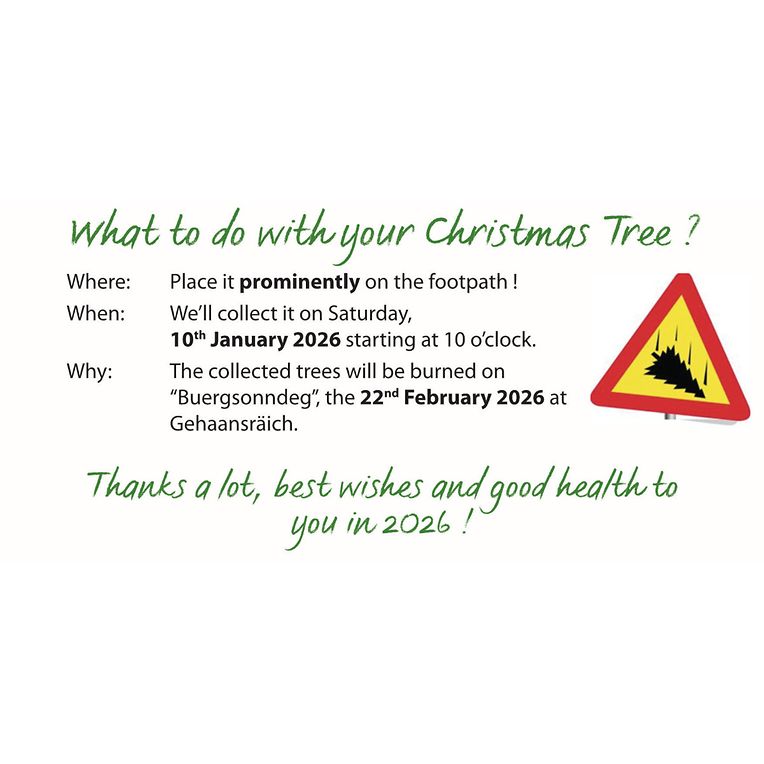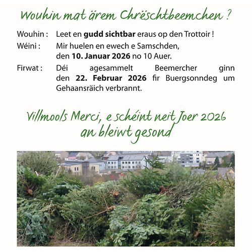The collected trees will be burned on “Buergsonndeg”, the 22nd February 2026 at Gehaansräich.
