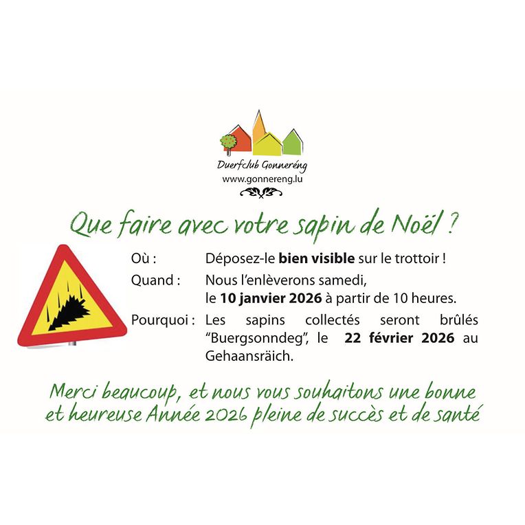 Les sapins collectés seront brûlés “Buergsonndeg”, le 22 février 2026 au Gehaansraich.