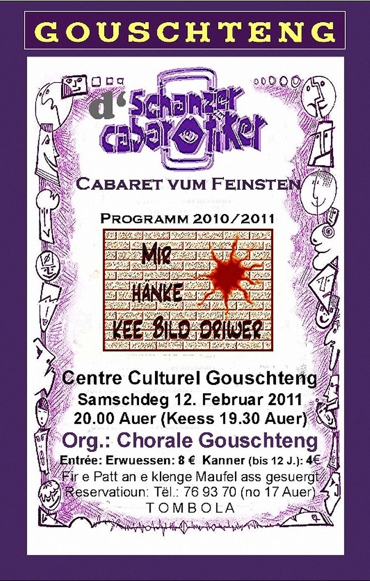 Op Invitatioun vun der Gouschtenger Chorale spillen déi Schanzer Kabarotiker och dëst Joer nees hire sprëtzege Programm am Festsall zu Gouschteng, an zwar samschdes, den 12. Februar um 20 Auer. (Keess 19.30 Auer) Den Entrée ass 8 Euro fir déi Grouss a 4 Euro fir Kanner bis 12 Joer. D'Équipe ronderëm de Rob Wagner deckt wéi ëmmer politesch a gesellschaftlech Mëssstänn op mat e.a.Texter vum Josy Braun, Vicky Wagner-Wies an dem Régisseur selwer, op flott Musek vu Lennon/Mc Cartney, Reinhard Mey...Natierlech däerf och d'Gëlle Fra an den Tour des Schleck net feelen! - Fir e Patt an e klenge Maufel ass gesuergt.- Flott Tombola!- Reservatioun um Tël.: 76 93 70 (no 17 Auer)