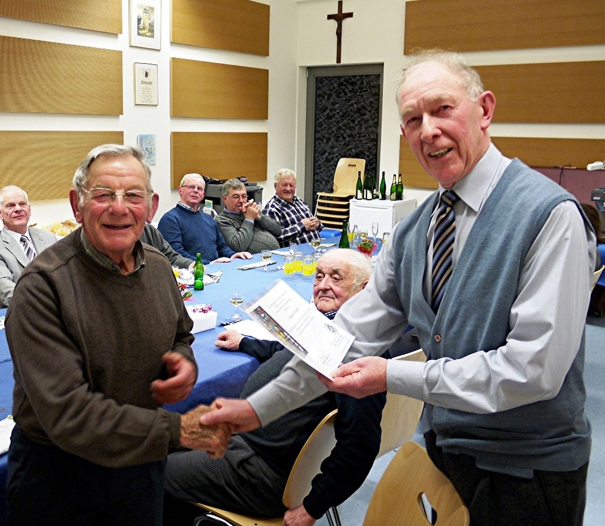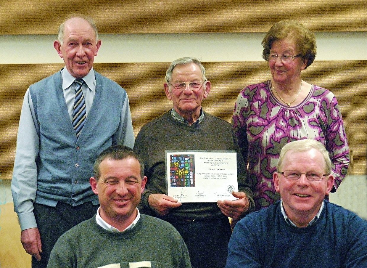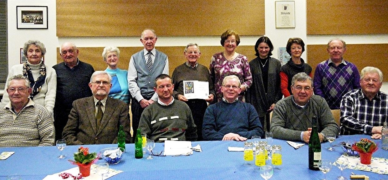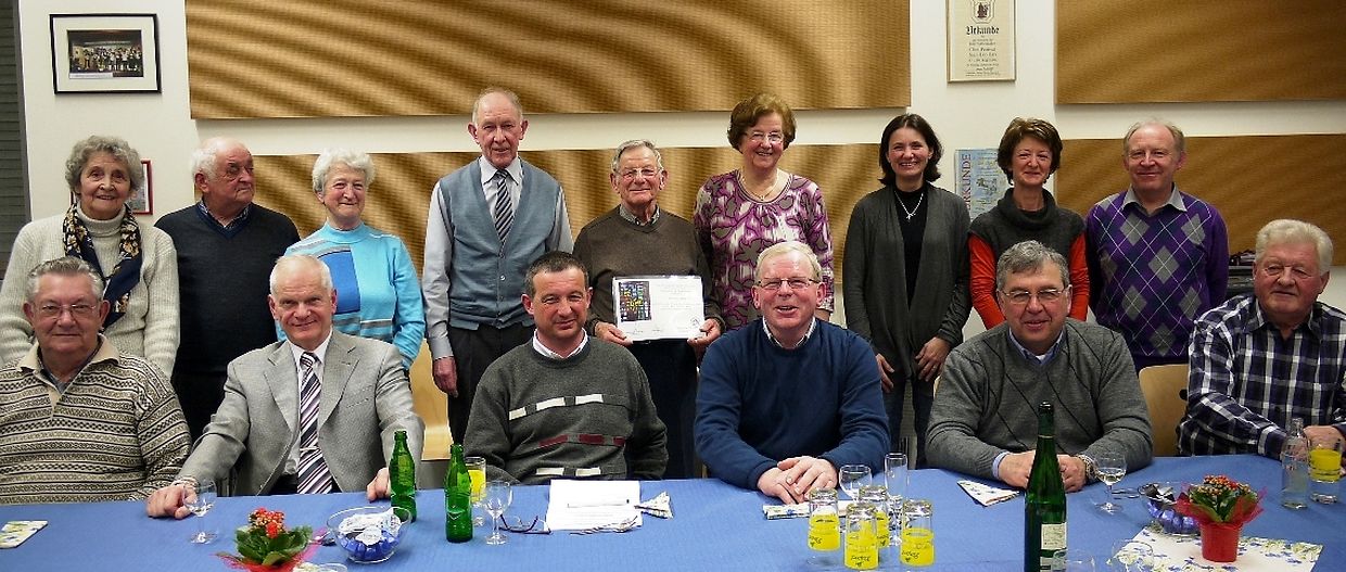 E Freideg, den 18. Februar, hat de Comité op déi alljährlech Generalver-sammlung an de Gesangssall am Centre Culturel invitéiert. Nieft den Aktiven woren dee frësch installéierten „Neien Här“ Alain Steffen, den Här Buergermeeschter Théo Weirich a säi Konzelljee Erny Apel an en etlech Frënn vun der Chorale komm. De President Gérard Schmit huet d’Gäscht begréisst a wor frou, dem Charel Schmit zu sengem Diplom vum Hw. Här Bëschof fir 60 Joer aktive Sänger kënnen ze gratuléieren. Hien huet och un den Doud vum eelste Sänger Victor Schmit am August erënnert, an et gouf ee Moment stëll un hie geduecht, ir de President dem Dirigent d’Wuert ginn huet.