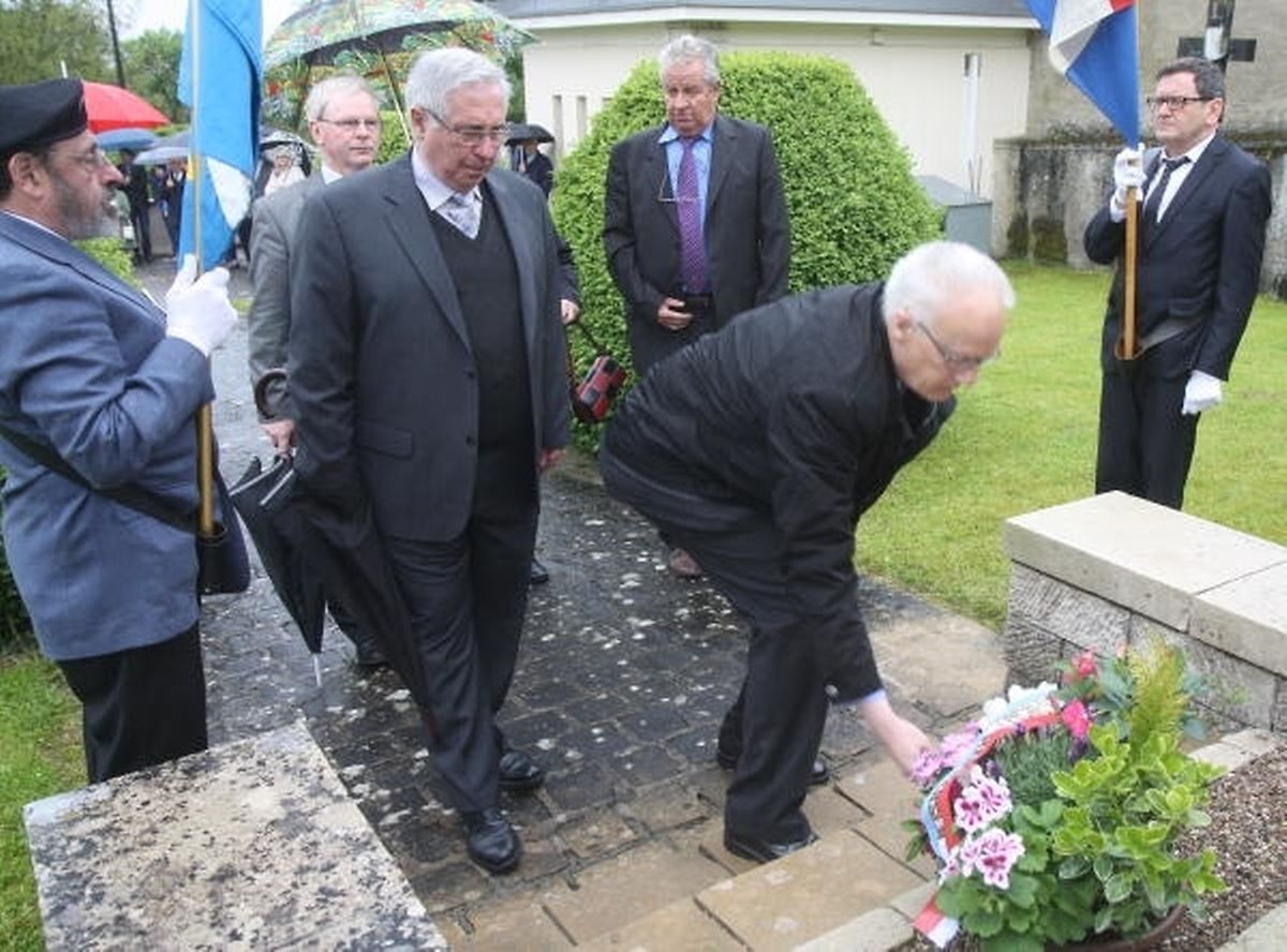Im Anschluss an den feierlichen Gottesdienst legten die Mitglieder im Gedenken an die Opfer ein Blumengebinde am „Monument aux morts“ nieder. Eine ehrfürchtige Verneigung vor dem Mahnmal, das Absenken der Fahnen als Ehrerbietung an die Gefallenen und die musikalische Untermalung der Zeremonie durch Edmond Faber als „Clairon du souvenir“ drückten dabei mehr als Worte aus.