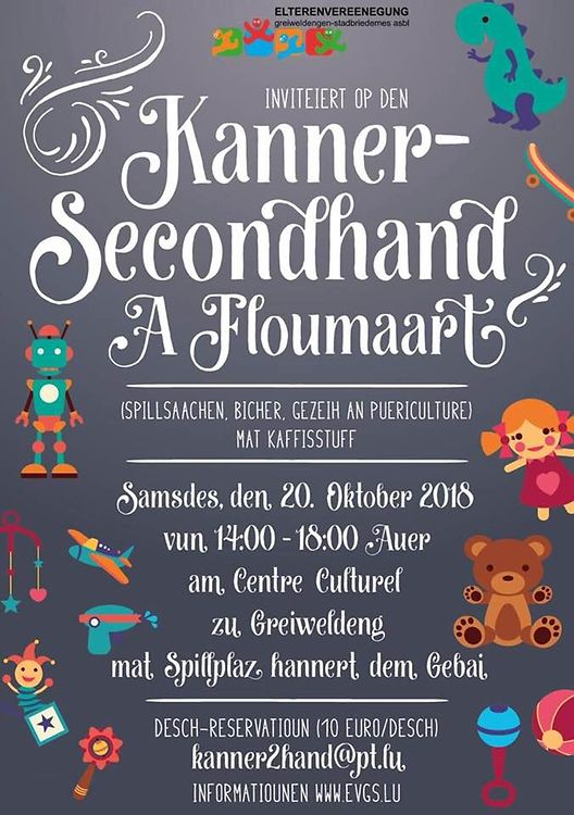 Et Elterevereenegung Greiweldeng-Stadbriedemes invitéiert op hiren Hiescht Kanner-Secondhand an Floumaart zu Greiweldeng am Veräinshaus, Samschdes den20. Oktober 2018 vun 14:00 bis 18:00 Auer. Macht eng gutt Affär an engem gemittlechen Kader zu Greiweldeng. An eiser Kaffisstuff gitt der mat enger gudder Taass Kaffi an engem gudden Stéck Kuch verwinnt. Nieft dem Veräinshaus ass och eng grouss Spillplaz.