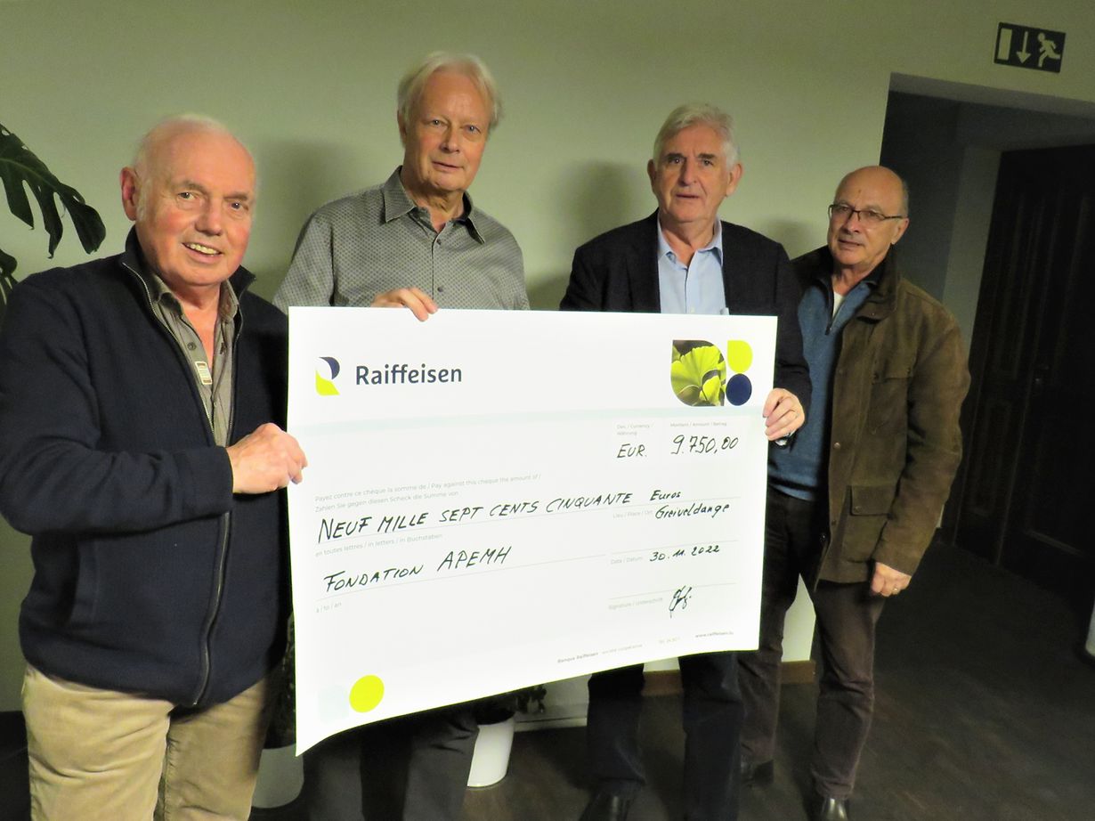Greiveldingen Scheckiwwerreechung – Antenne collective Greiveldange Domaine Du Château Fondation A.P.E.M.H. Veröffentlicht am Mittwoch, 11. Januar 2023 um 16:49 Greiveldange, Stadtbredimus, Luxemburg D’Antenne collective Greiveldange huet no hirer Opléisung een Don vun 9.750 Euro un d’APEMH gemaach. Am Numm vun der ganzer APEMH soe mir hinne villmools Merci fir dëse generéisen Don. Unpassenden Inhalt angeben Weitere Neuigkeiten von Domaine Du Château Fondation A.P.E.M.H. > Inauguratioun vum Wunnkomplex Veianen 23.04.25 Vianden Aweiung « Zentrum fir selbstbestëmmt Liewen » vun der APEMH zu Esch (27.09.23) 28.09.23 Esch/Alzette Porte ouverte Ateliers de l’APEMH à Bettange - 06.05.2022 06.05.22 Bettingen/Mess