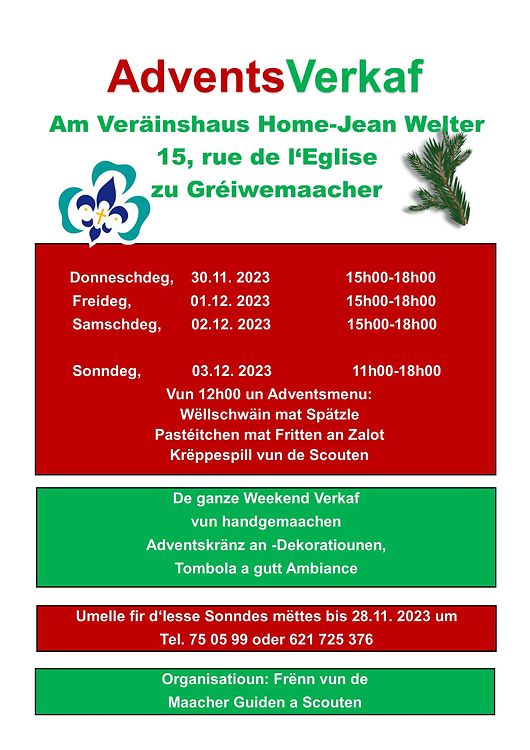 D´Frёnn vun de Maacher Guiden a Scouten organiséiere vun Donneschdeg 30.11. bis Sonndeg 03.12.2023 hiren traditionellen Adventsverkaf am Veräinshaus – Home Jean Welter op Nr. 15 Rue de l´Eglise zu Gréiwemaacher.