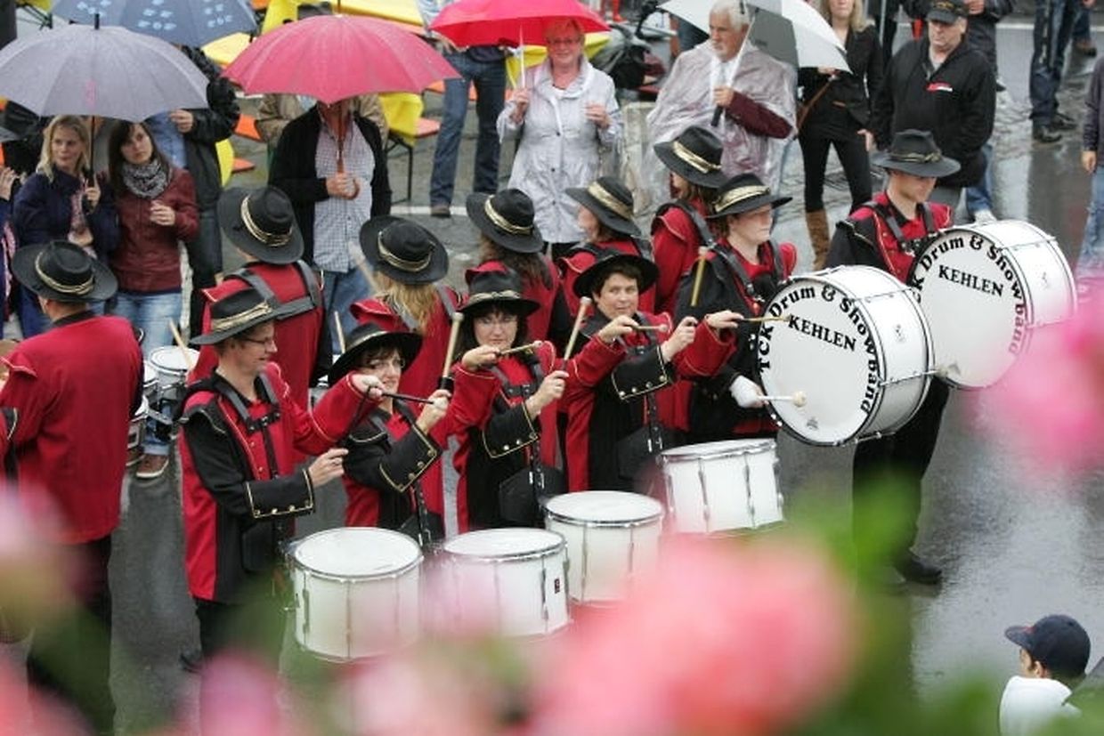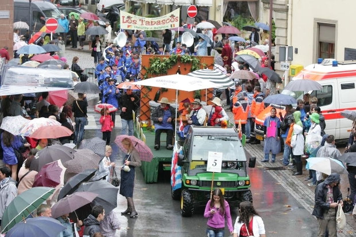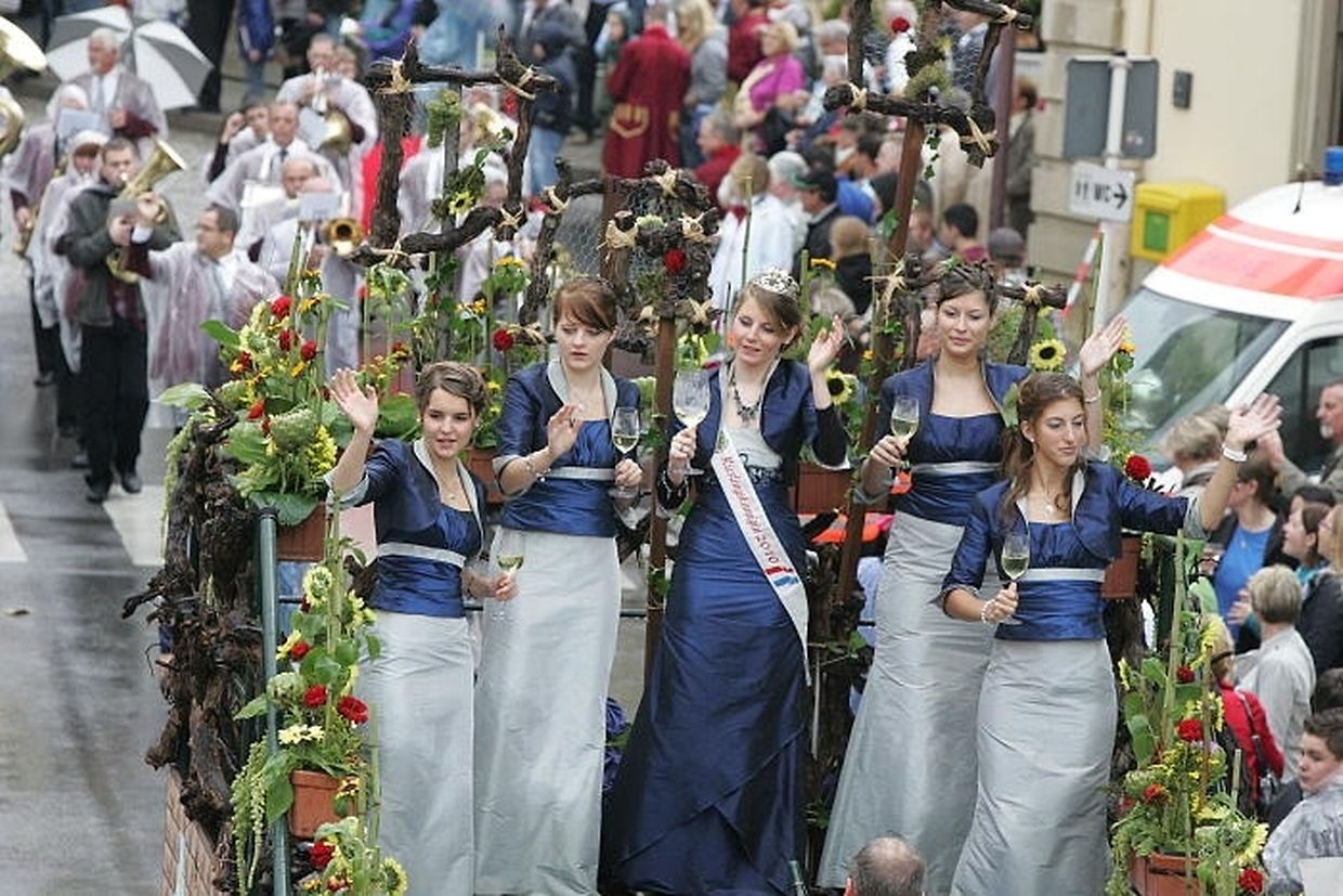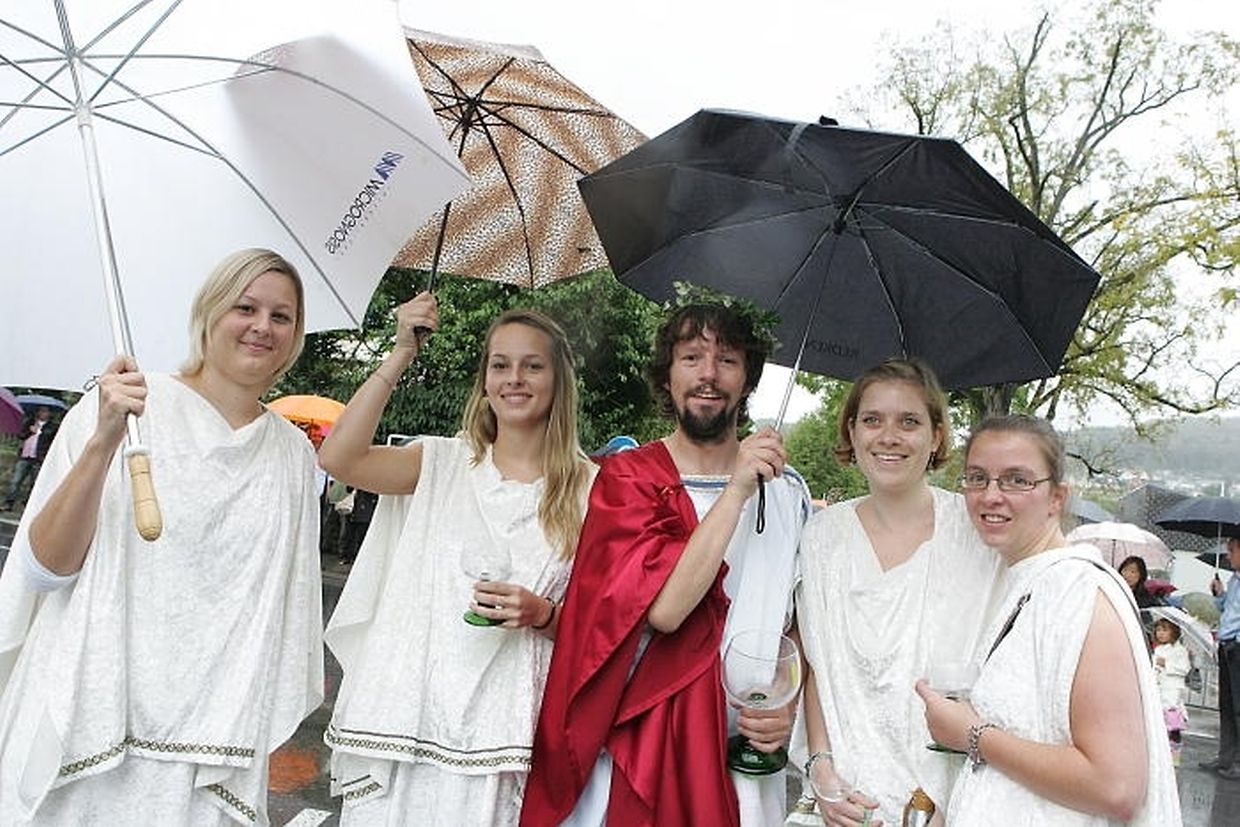 Wenig Einsehen mit den Weinfreunden hatte Wettergott Petrus allerdings gestern. Obwohl es teilweise mehr oder weniger heftig regnete, tat dies der Stimmung keinen Abbruch. Dennoch ließen sich wiederum tausende Besucher den traditionellen Umzug mit 42 Festwagen, Folkloregruppen und Musikvereinen nicht entgehen.