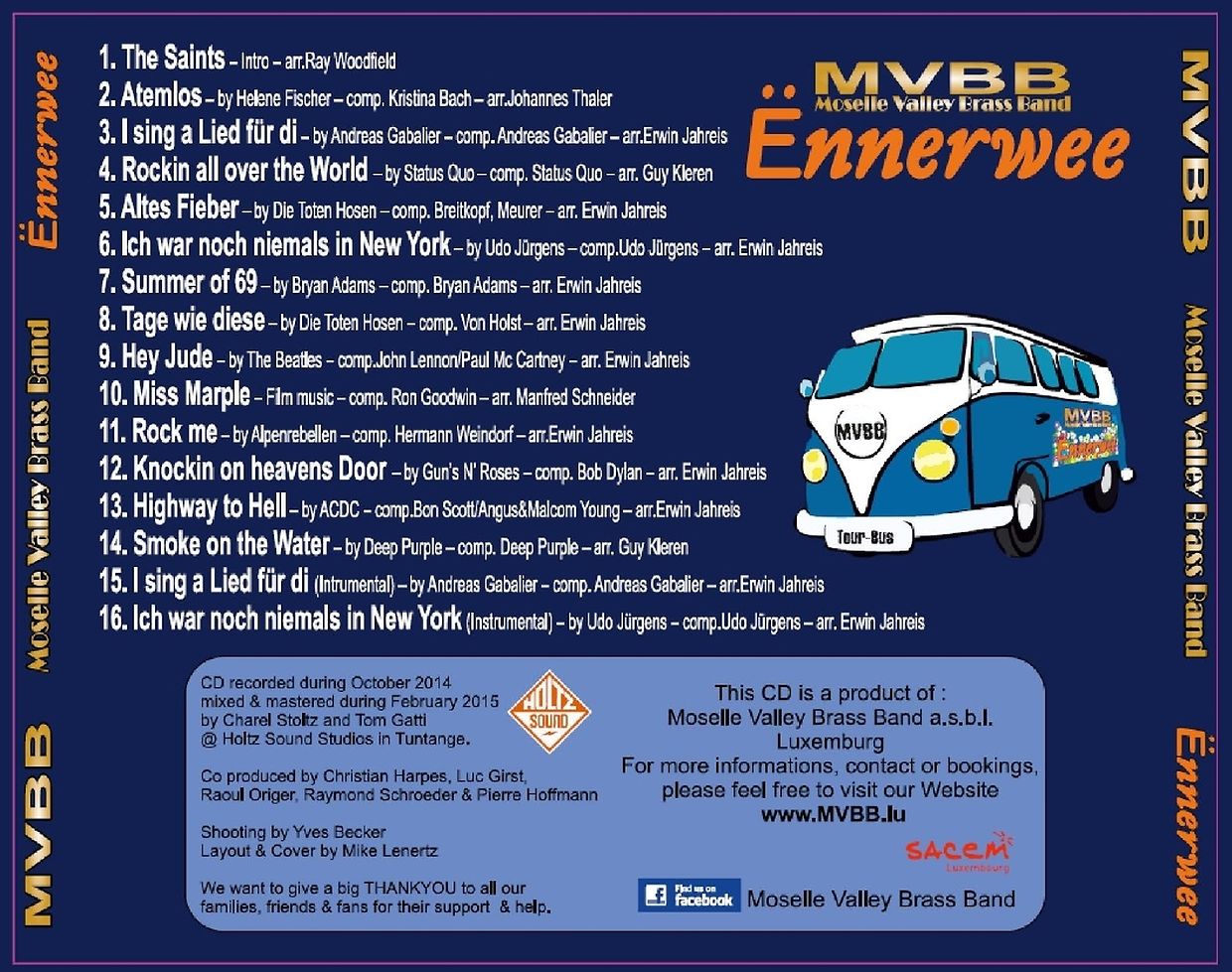 Die 16 verschiedene Evergreens und Hits auf der CD, u.a. von Helene Fischer, Udo Jürgens, Andreas Gabalier, Toten Hosen, Deep Purple oder ACDC, instrumental bestens arrangiert für die 19 Mann-Formation der Moselle Valley Brass Band, werden bestimmt großen Anklang bei den Blasmusikliebhabern im In- und Ausland finden. Drei Titel von den insgesamt 16 Liedern wurden zusätzlich vom Sänger Yves Schmartz interpretiert.
