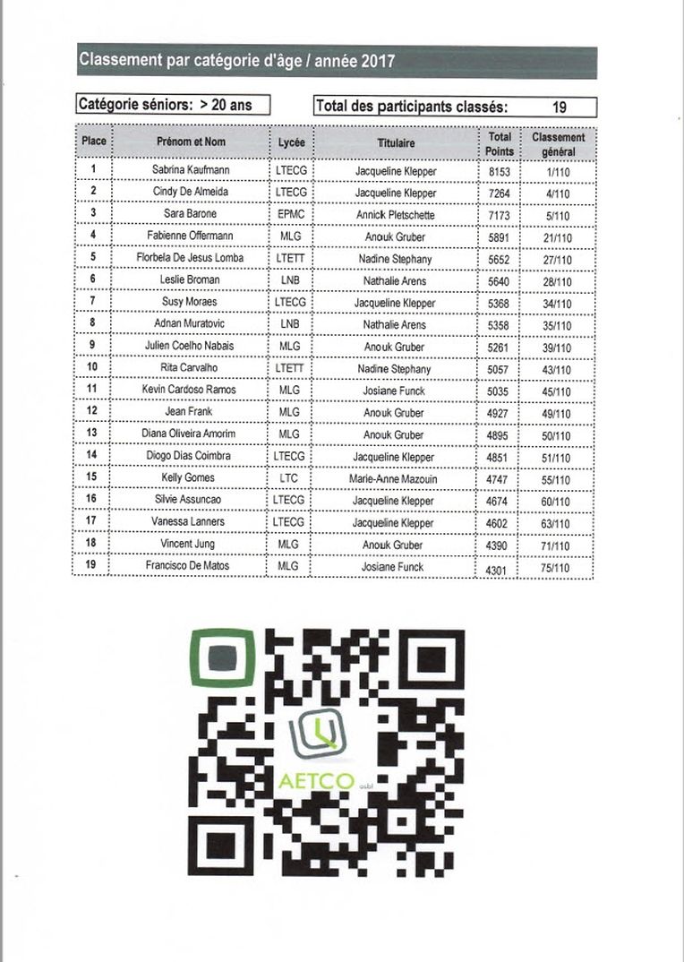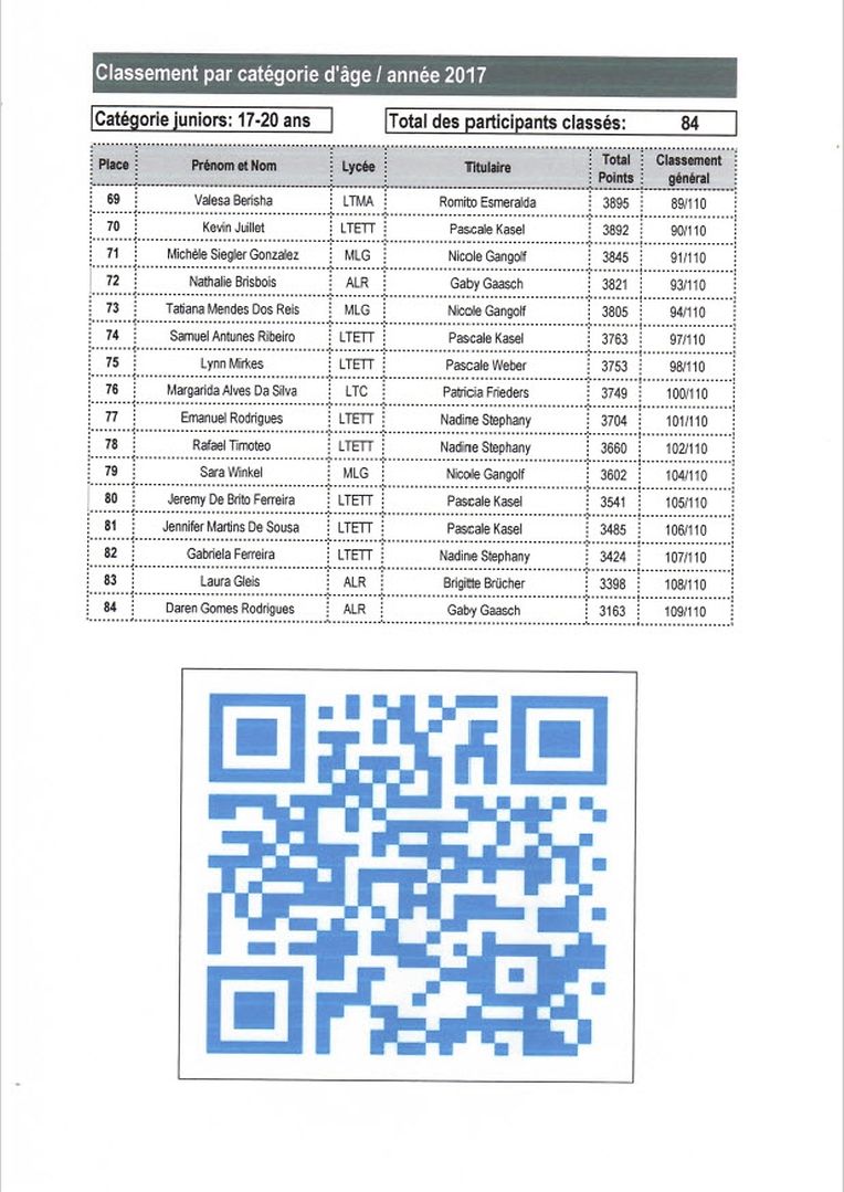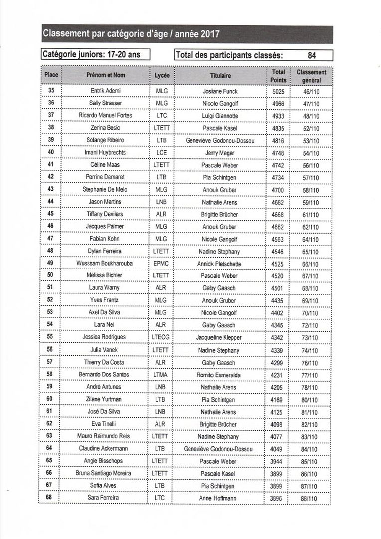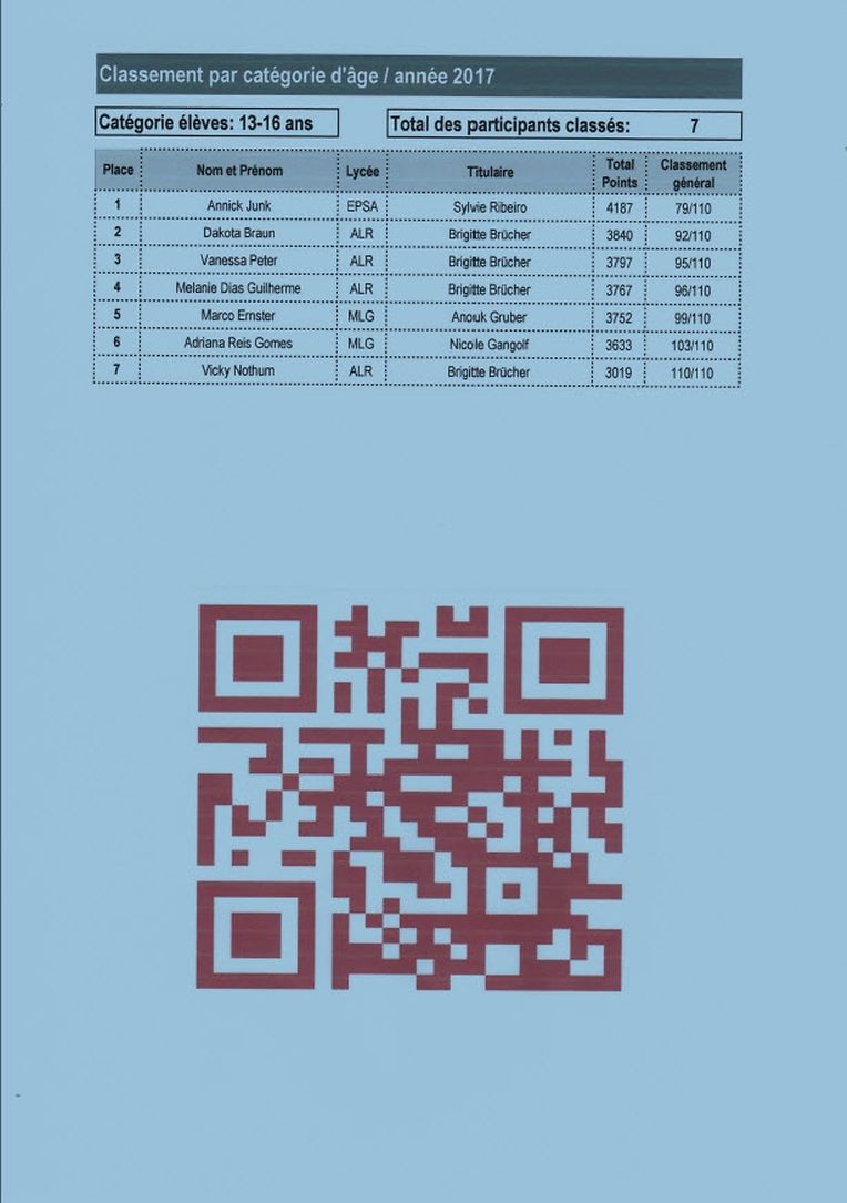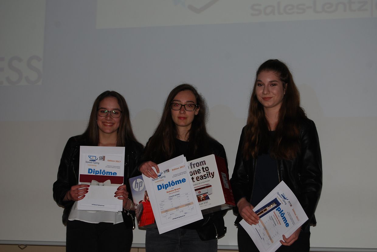 Landesmeisterin 2017 ist Sabrina Kaufmann aus der „Ecole de Commerce et de Gestion“ mit durchschnittlich 272 Nettoanschlägen/Minute. Vizelandesmeisterin ist ihre Schülerkollegin Célia Da Rocha mit durchschnittlich 263 Nettoanschlägen/Minute. Der 3. Platz im Gesamtklassement geht an Martha Simoes aus dem „Lycée technique de Bonnevoie“.