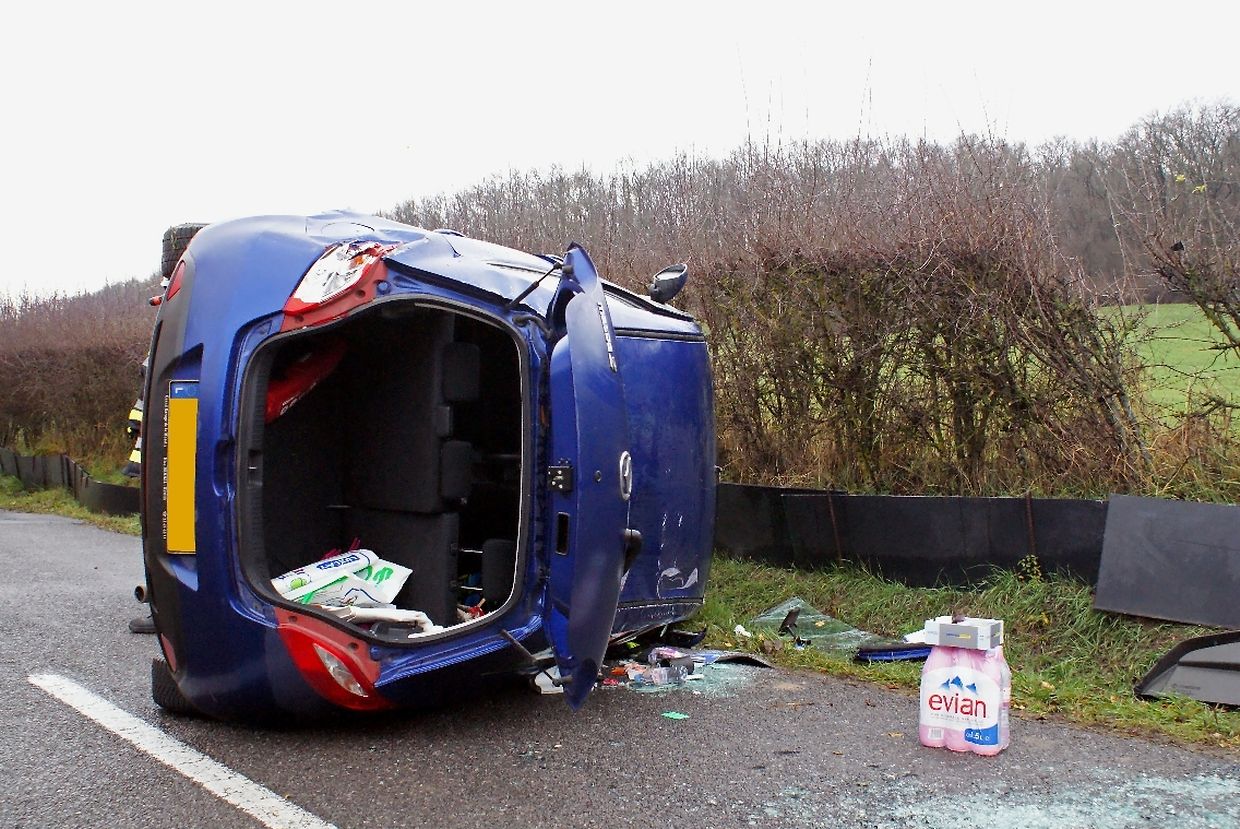 Eine Fahrerin, die aus Richtung Grevenmacher kam, hatte in einer scharfen Linkskurve aus bisher noch unbekannter Ursache die Kontrolle über ihren Wagen verloren, wobei der Wagen daraufhin in den Seitenstreifen geriet. Beim Versuch, den Wagen wieder auf die Strasse zu lenken geriet der Wagen ins Schleudern und überschlug sich anschliessend ehe es auf der Beifahrerseite liegend zum Stillstand kam. In dem Wagen, in dem zwei Personen Platz genommen hatten blieb die Beifahrerin im Wagen eingeschlossen. Sie musste mittels schwerem hydraulischem Gerät aus ihrer misslichen Lage befreit werden. Sowohl Fahrerin als auch die Beifahrerin wurden bei dem Unfall leicht verletzt und mussten in die Zithaklinik eingeliefert werden. Am Wagen entstand Totalschaden. Die Strecke von Grevenmacher nach Schorenshof musste während der Dauer der Rettungsarbeiten für eine halbe Stunde voll gesperrt werden.