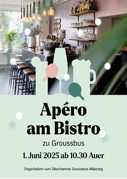 Grosbous Apéro am Bistro Al Post Claude Glesener Veröffentlicht am Mittwoch, 21. Mai 2025 um 09:22 Groussbus-Wal, Luxemburg Den 1 Juni 2025 ab 10.30 Auer ass erëm Apéro Zait an der Aler Post zu GROUSSBUS Mat den Memberen vum Dëschtennis Groussbus-Mäerzeg am Service Vir Iessen an Gedrenks ass gesuergt Unpassenden Inhalt angeben Weitere Neuigkeiten von Claude Glesener > Een Erfolleg räichen 1 Mee Tournoi vum Dëschtennis Groussbus-Mäerzeg 20.05.24 Grosbous Kannerfuesbal 27.01.24 Grosbous Kannerball 27.01.24 Mertzig Réckbléck op eng an villen Hinsichten Erfollegräich Saison 2022/2023 14.08.23 Grosbous Kannerfuesbâl zu Mäerzeg 09.02.23 Mertzig