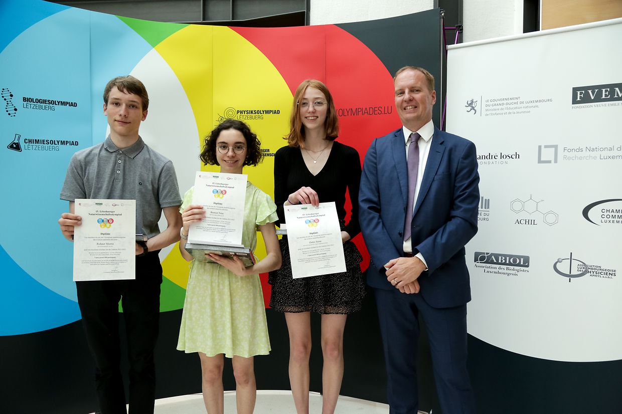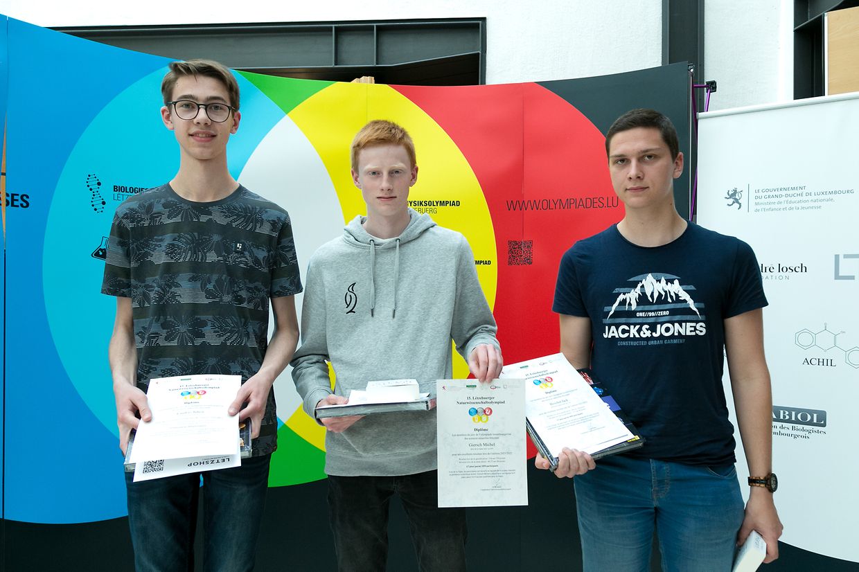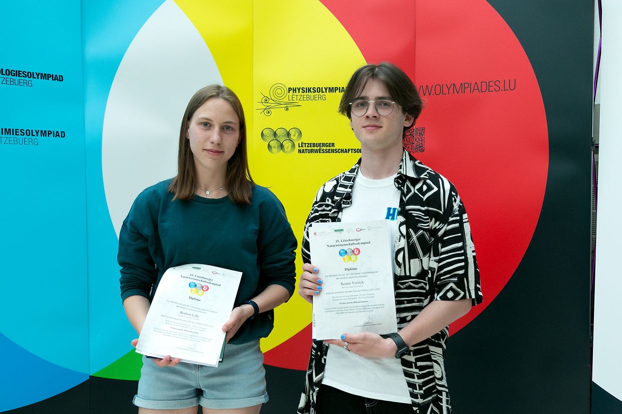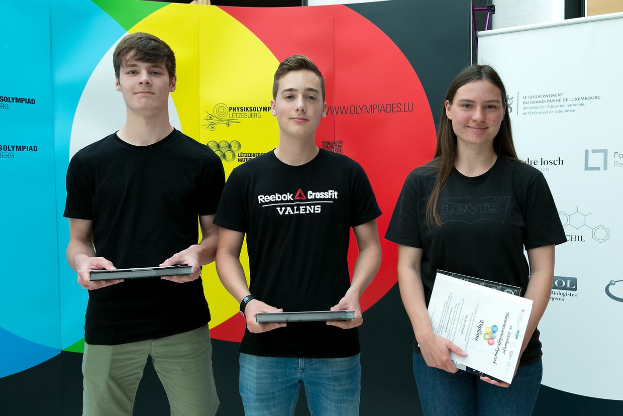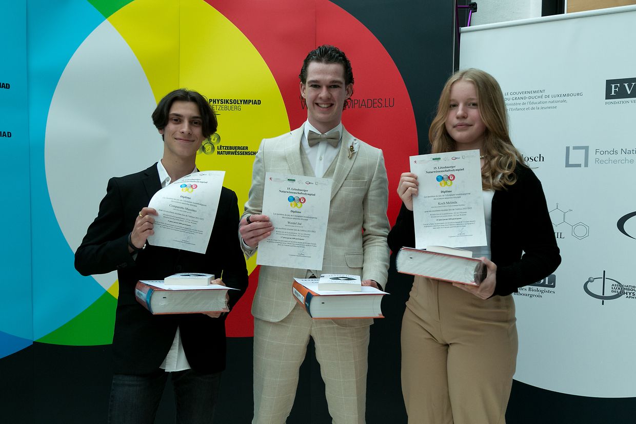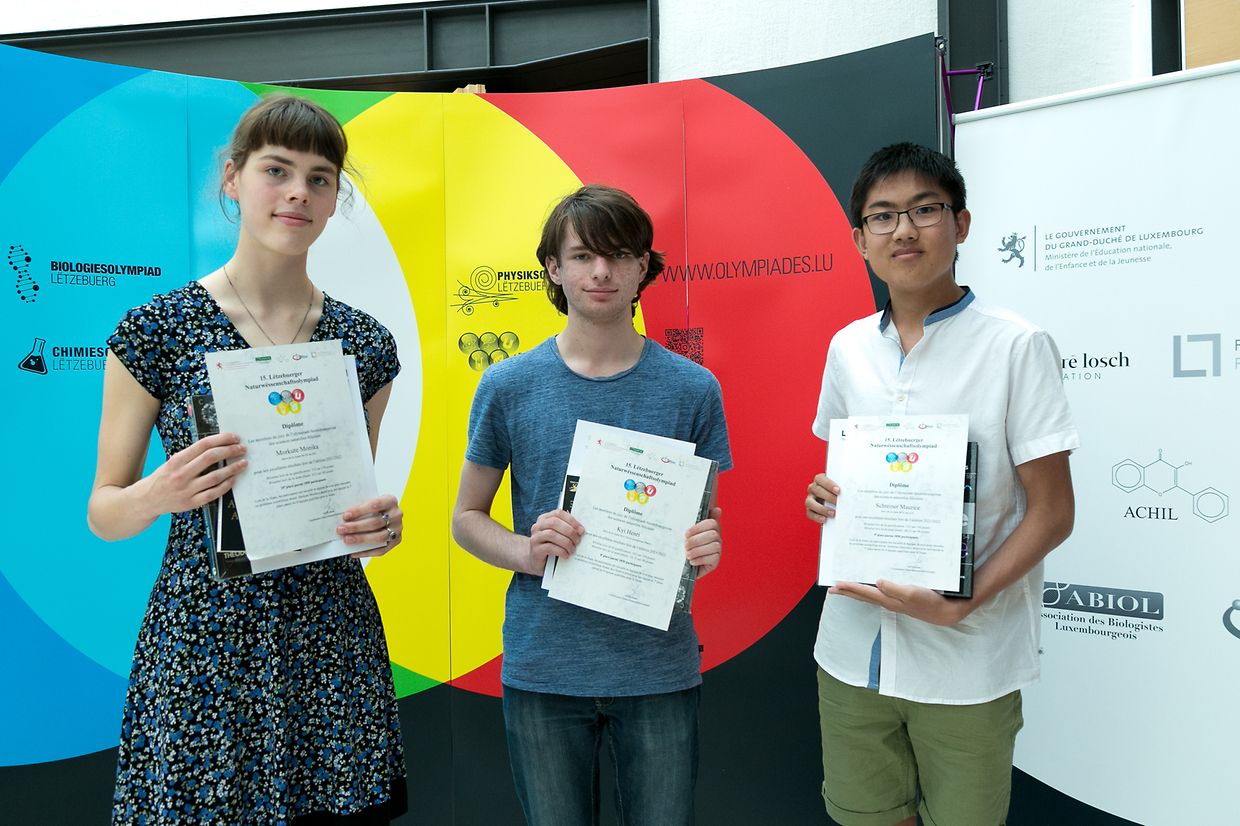 Nach Auswertung der Ergebnisse durch die Jury konnten die Siegerteams bestimmt und alle Finalisten im Rahmen der Preisverleihung im Naturmusée geehrt werde. Siegreich bei der 15. Luxemburger Naturwissenschaftsolympiade waren Nina Bernier (LGL), Siena Ootes (EE Kirchberg) und Moritz Rohner (LGE). Auf Platz zwei landeten Melinda Koch (EE Kirchberg), Joé Werdel (LCD) und Massimo Comparetto (LGL). Diese beiden Teams durften Luxemburg bei der European Olympiad of Experimental Science vertreten. Alle Finalisten erhielten Sachpreise. Die Aufgaben sowie alle Ergebnisse der diesjährigen Auflage sind unter www.nwo.lu zu finden.