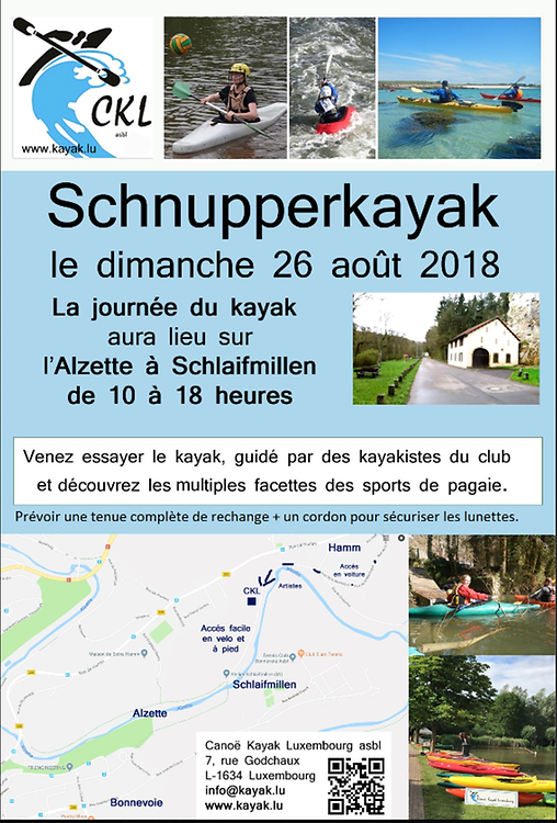 Vous trouvez le flyer et des informations plus détaillées sur le site internet du club (visualisation optimale avec Mozilla Firefox) "Canoë Kayak Luxembourg" : http://www.kayak.lu/.