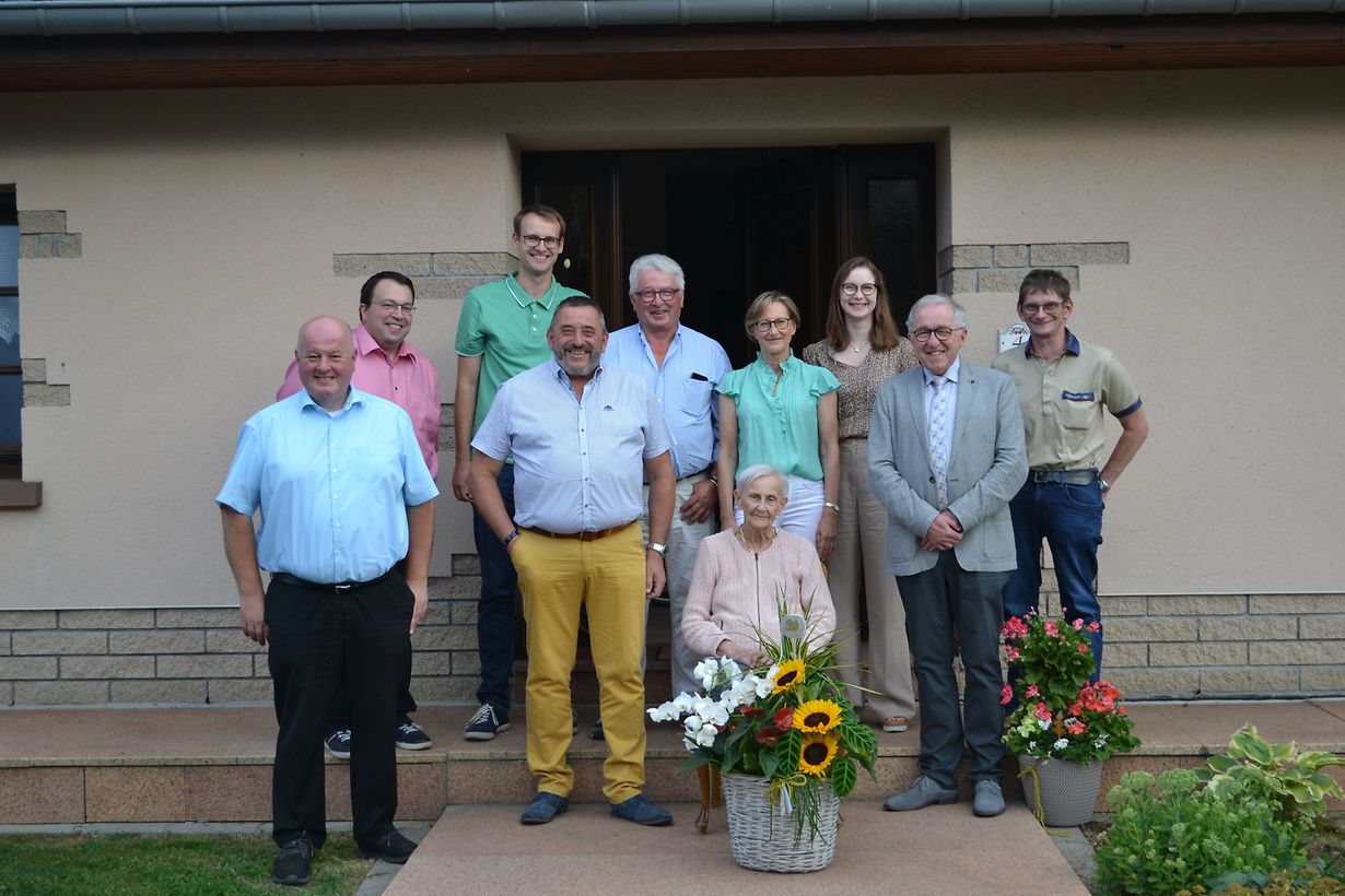 Bürgermeister René Michels in Begleitung seiner beiden Schöffen Francis Schon und Marco Koeune sowie den Räten Romain Koeune und Jean-Paul Staudt statteten am 30. August 2022 der Jubilarin einen Besuch ab und überreichten ihr zum Ehrentag ein Blumenarrangement und einen kleinen Familien-Stammbaum welcher recherchiert und angefertigt wurde von Herrn René Daubenfeld, einer Kopie ihrer Geburtsurkunde und Heiratsurkunde.