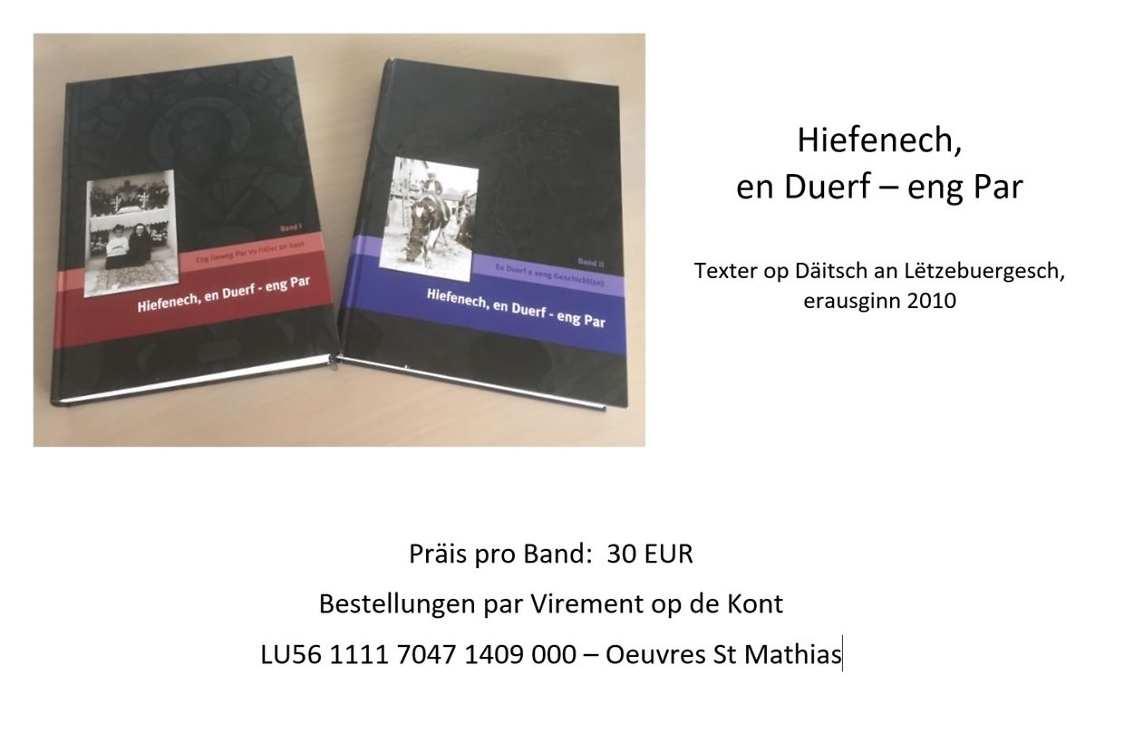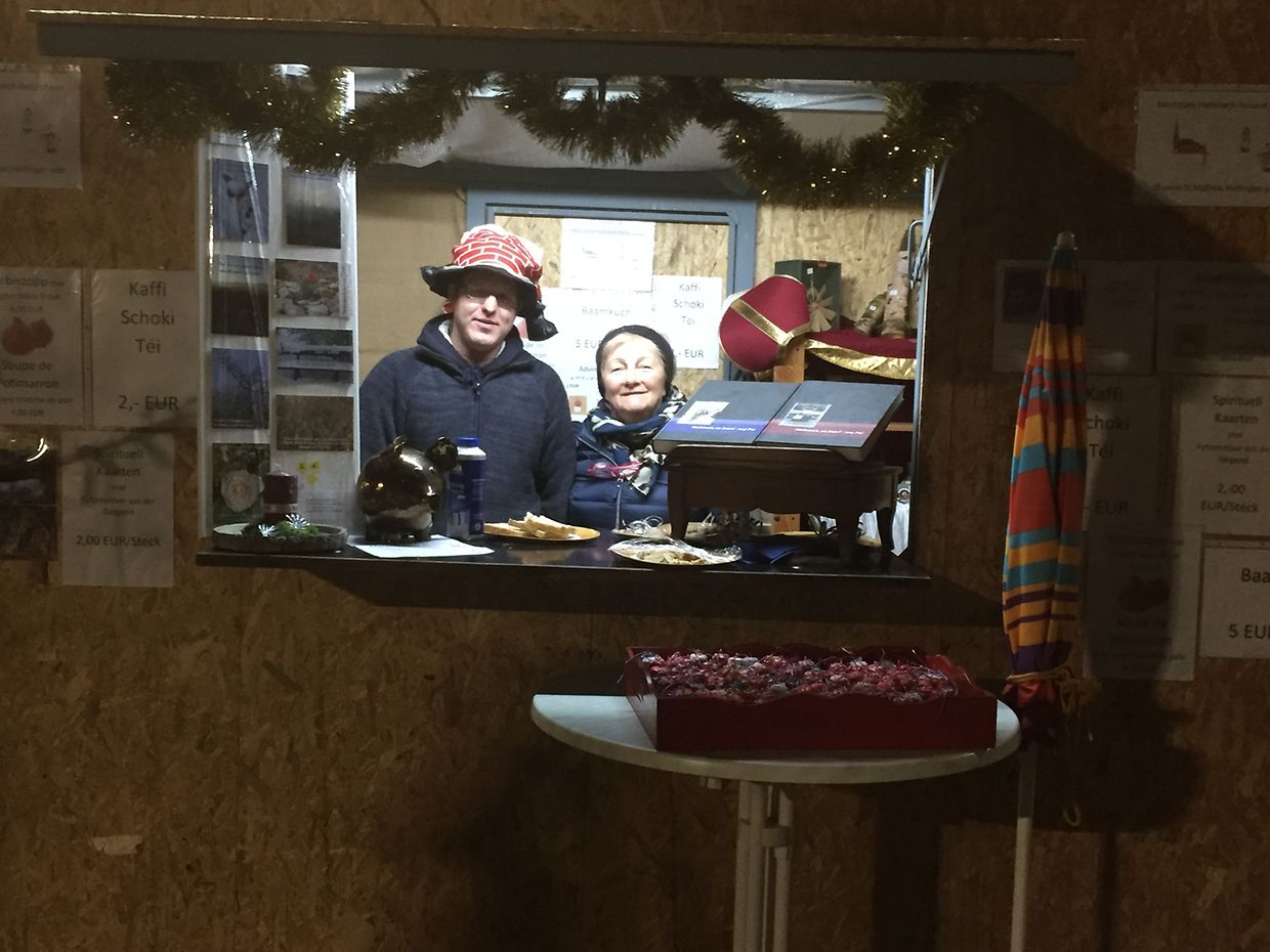 Der gemeinsame Stand von Ministrare Hiefenech-Reiland asbl und Oeuvres St Mathias asbl bot wieder Gelegenheit, bei einer Tombola adventliche Preise zu gewinnen, selbst kreierte Beileidskarten (mit Motiven aus der Umgebung und luxemburgischem Text) und Weihnachtsgrußkarten sowie das zweibändige Werk „Hiefenech – en Duerf, eng Par“ zu erwerben bzw. zu bestellen.