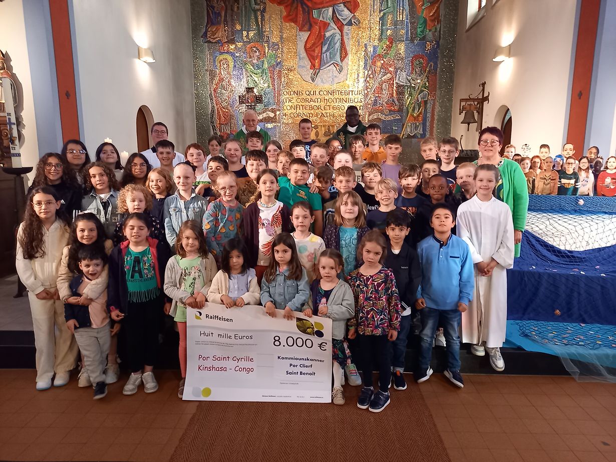 Am Kader van der Danksagungsmass zum Aafschloss van der Kateches an vam Schouljoer, honn d’Kanner aus der Por St.Benoît Cliärref zu Hengescht an der Kirrich ee Scheck van 8.000 Euro an den Abbé Benjamin NKembo iwwerreecht.