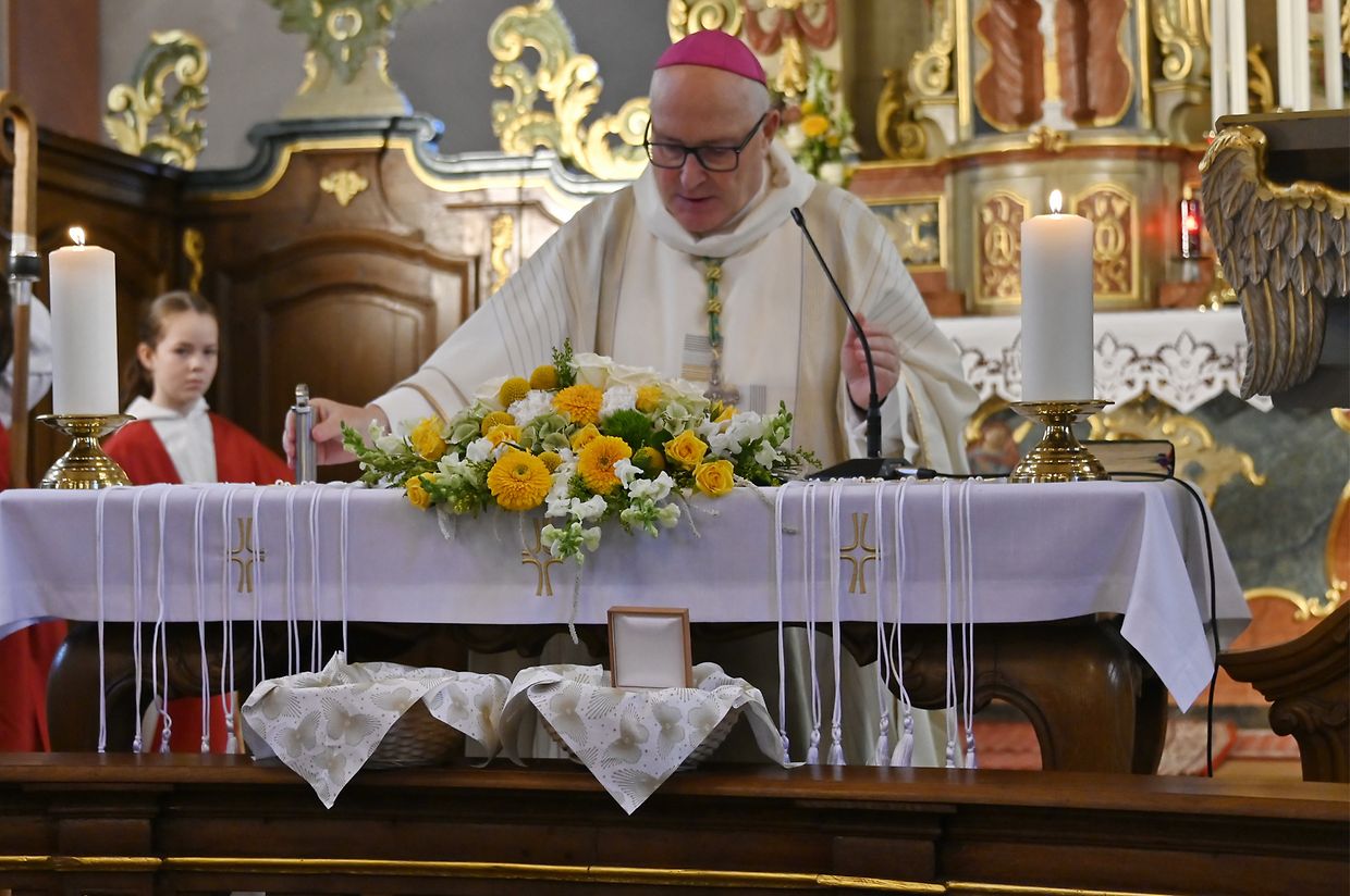 Den Afang van der Mass koumen d'Kanner mat hire Lanteren an Kierich. D'Begréissung mat engem geschichtliche Réckbléck gouf vam Paschtouer Henri Hamus virgedroen,. D'feierlich Mass hat den Här Weihböschof Leo Wagener zelebréiert, zesamen mam Paschtouer Lubomir Fabcin, an mam Paschtouer Michael Müller.