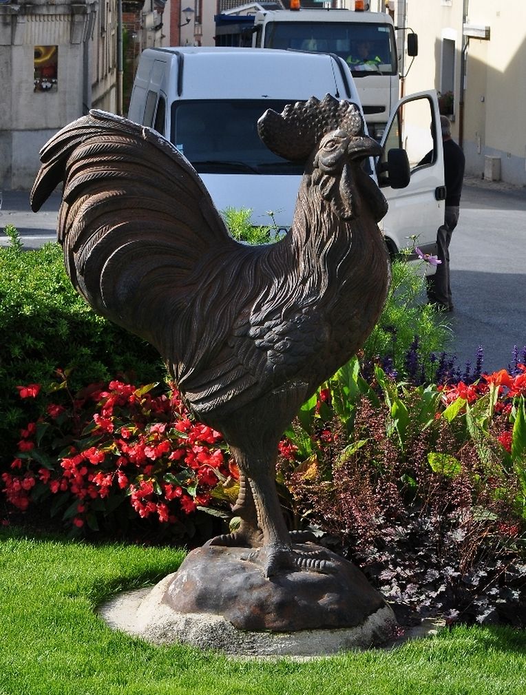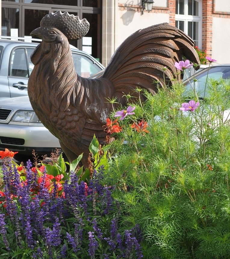 2.Die Figur des Hahnes, ev. auch zusammen mit pickenden Hühnern soll auf das frühere Dorfleben hinweisen.