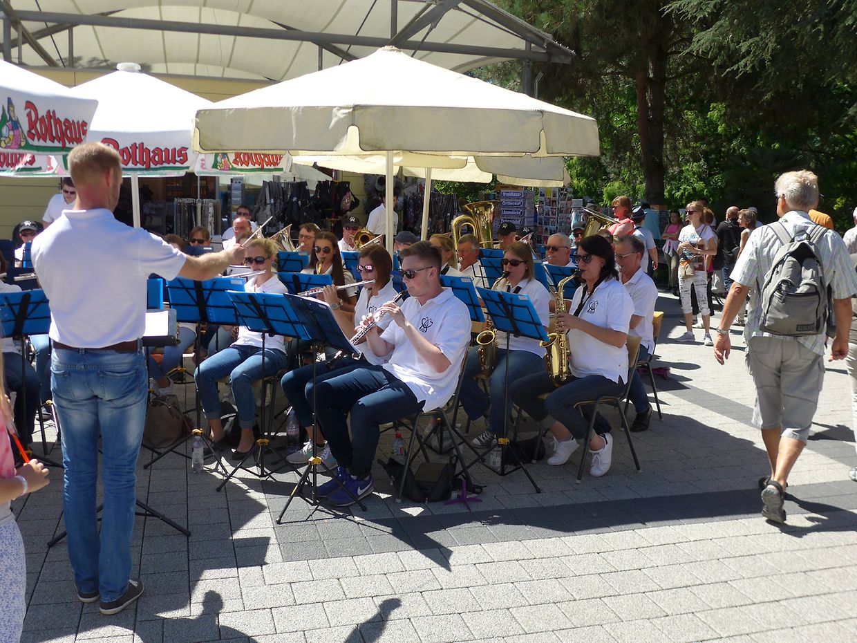 No enger lëschteger Busrees mat 2 Busse vun der Firma Unsen war deen éischten Owend an der nei renovéierter Jugendherberg haaptsächlech geduecht fir ze relaxen an d’Ëmgéigend op der Insel Lindau kennen ze léieren. Ma spéit duerft et net ginn, well deen nächste Moien si mir scho fréi op d’Insel Mainau gestart. „D’Blummeninsel“ oder och nach „Madeira an Däitschland“ wéi eise Chef se ëmmer nennt. An deenen Nimm gëtt si absolutt gerecht. Eng ganz kleng Insel, mä et fillt een sech wéi am Paradäis. Eng immens faarweg Landschaft duerch dee schéine Séi mat all Zorte vu Schëffer an dausende Blummen a Planzen. Ma dat geet nach net duer; fantastesch Beem, abenteuerlech Spillplaze fir déi Kleng, e klenge Bauerenhaff, e Päiperléksgaart an natierlech e flott Schlass, faarweg ëmspillt vun de wonnerbare Blummen a fir d’Ofkillung op deene waarme Summerdeeg natierlech gemittleche Béiergäert mat perfekter Vue. Op sou enger inspiréierender Insel konnt d’Musek sech nëmme wuel fillen a sou huet och eise Concert bäi der Rothaus Seeterrasse säin Uklang fonnt. D’Besicher vun der Blummeninsel hu fir hiren Applaus natierlech och déi néideg Zougabe kritt.