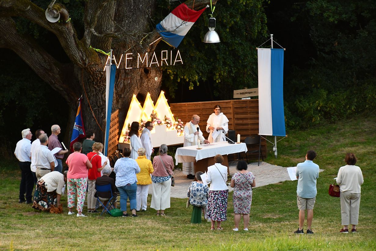 Die Wurzeln der Marienverehrung gehen auf ein Ereignis am 30. Mai 1731 zurück, als drei Brüder bei einem Ausflug in der Nähe einer 20 Meter hohen Eiche von einem schweren Gewitter überrascht und vom Blitz getroffen wurden. An diesem schicksalhaften Tag starben zwei der Brüder noch an Ort und Stelle. Bernard Deitz, der das Unglück überlebte, stellte aus Dankbarkeit für seine Rettung ein Marienbild in den hohlen Stamm der Eiche. Dieses Ereignis gilt als Ursprung der Wallfahrt, die seither Gläubige aus nah und fern anzieht. Das festliche Hochamt wurde von Pfarrer Carlo Morbach zusammen mit weiteren Geistlichen unter der uralten Eiche gefeiert. Zum Abschluss segnete er den „Wësch“, die gebundenen Kräutersträuße. Pfarrer Morbach dankte der Familie Thill aus Hersberg für den Blumenschmuck sowie der Musikgesellschaft, dem Kirchenchor und allen Helferinnen und Helfern, die zum Gelingen des stimmungsvollen und besinnlichen Festes beigetragen haben.