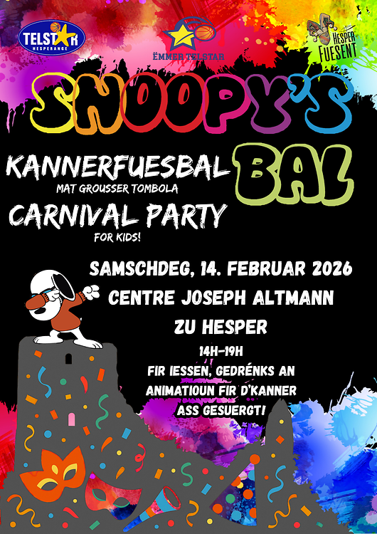 De 14. Februar fennt erem dem Telstar säi bekannte Kannerfuesbal: de Snoopy‘s Bal zu Hesper am Centre Jos. Altmann (Centre Civique) statt.