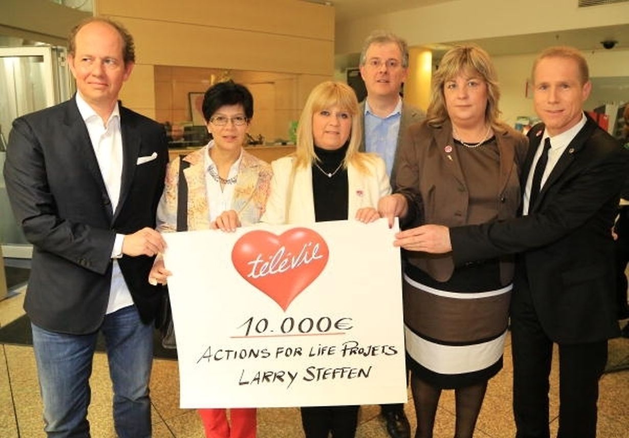 Joëlle et Claude Steffen-Lentz ainsi que deux membres du conseil d'administration de l'association ont remis un chèque de 10.000 euros à Carol Bragança, coordinatrice du Télévie, et à Jean-Louis Schiltz, président du Télévie.