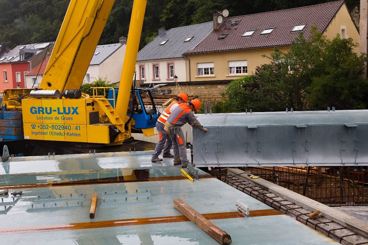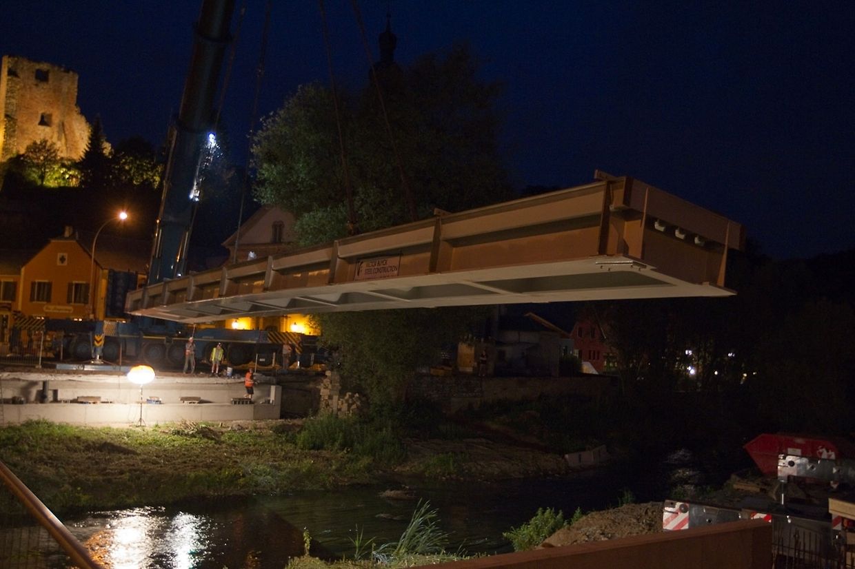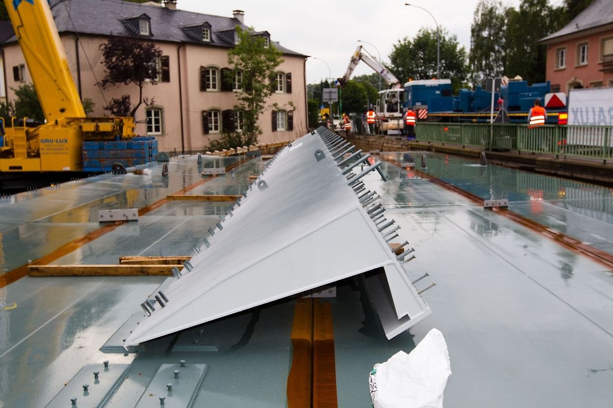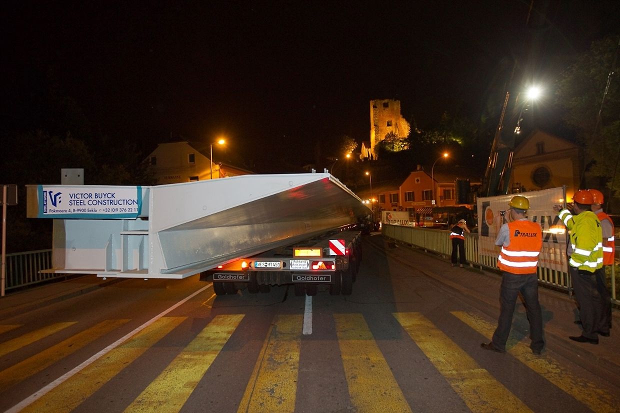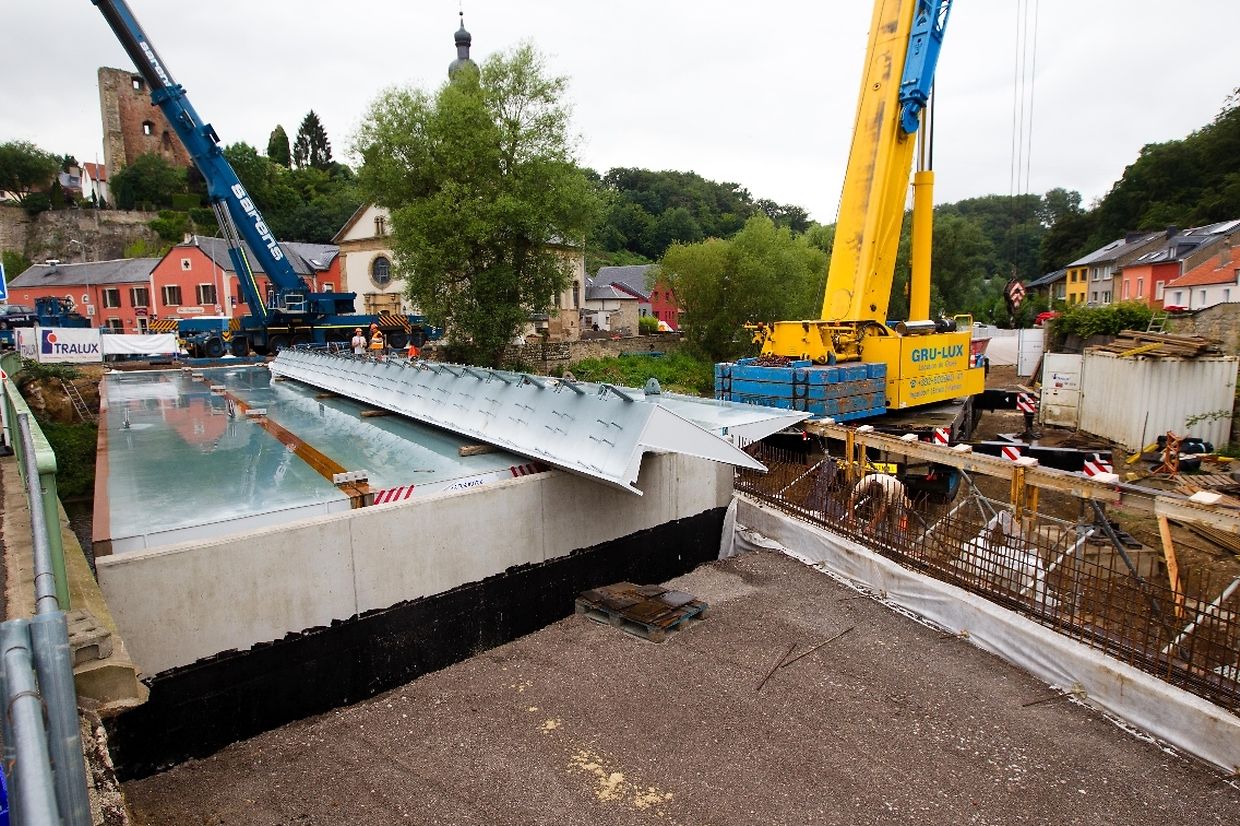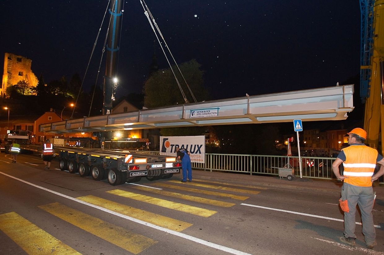 Den Eischten deel vun der neier Hesper Bréck ass gesat, iwwert Nuecht huet eng spezialiséiert Firma mat engem 700T Kraan di eenzel Elementer an Positioun bruecht. een Element hat ee Gewiicht vun ëmmerhin 40T.