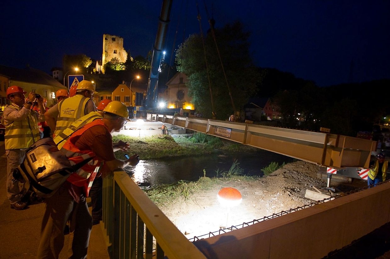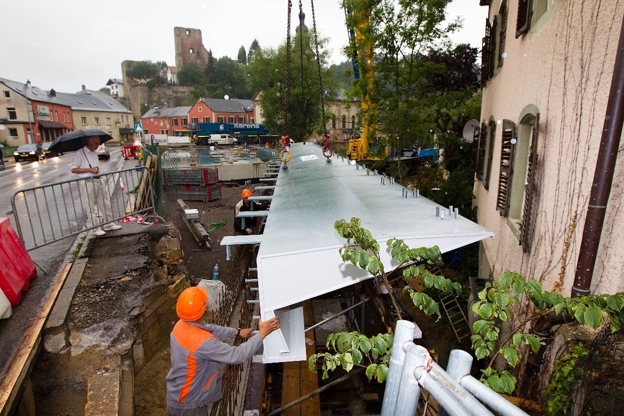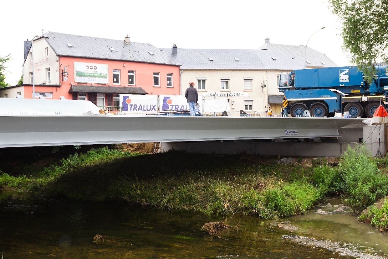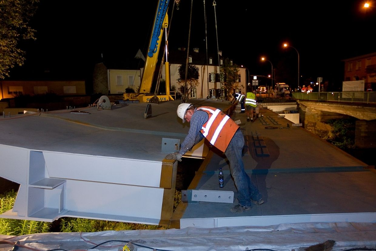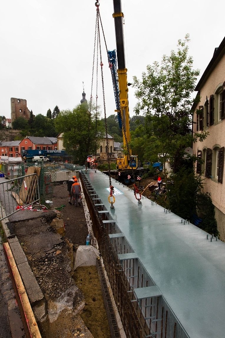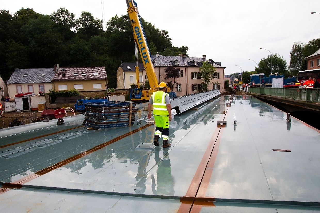 Den Eischten deel vun der neier Hesper Bréck ass gesat, iwwert Nuecht huet eng spezialiséiert Firma mat engem 700T Kraan di eenzel Elementer an Positioun bruecht. een Element hat ee Gewiicht vun ëmmerhin 40T.
