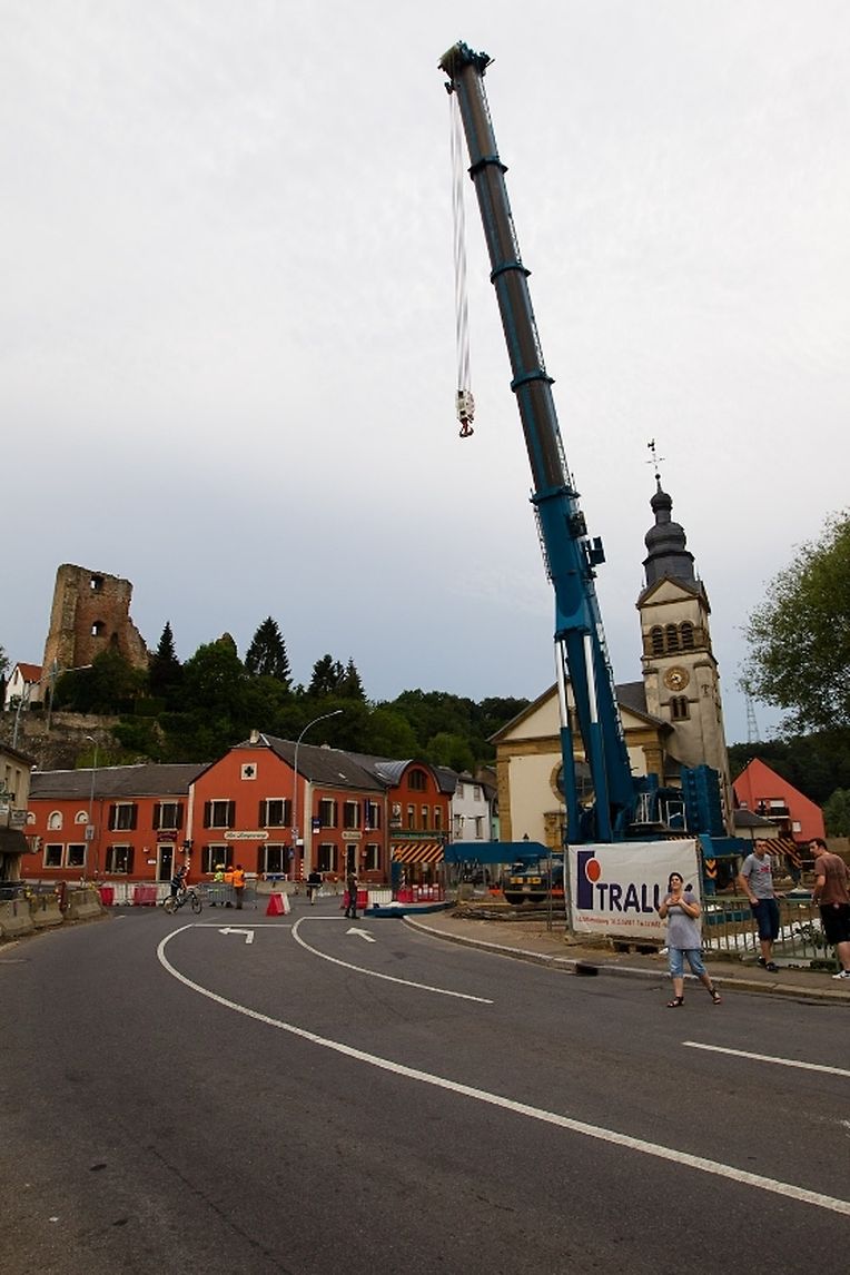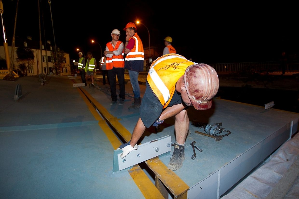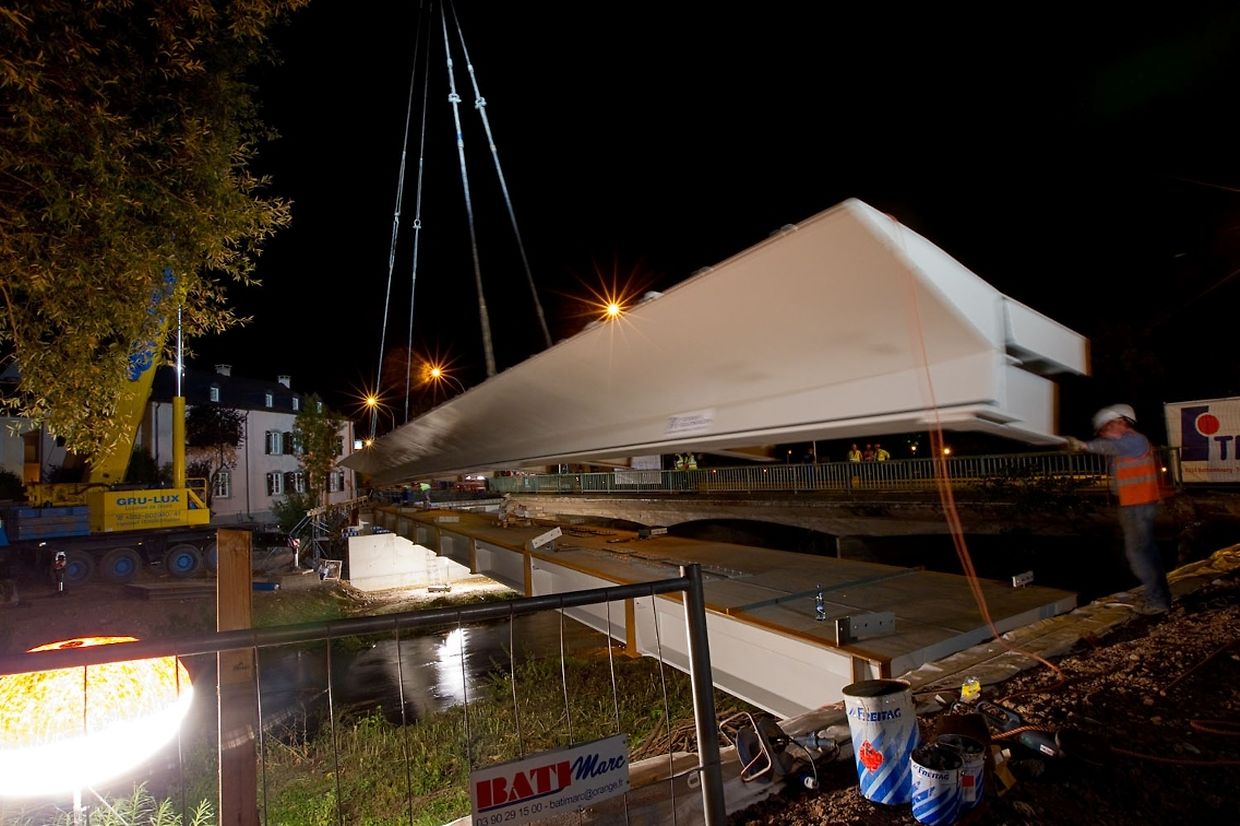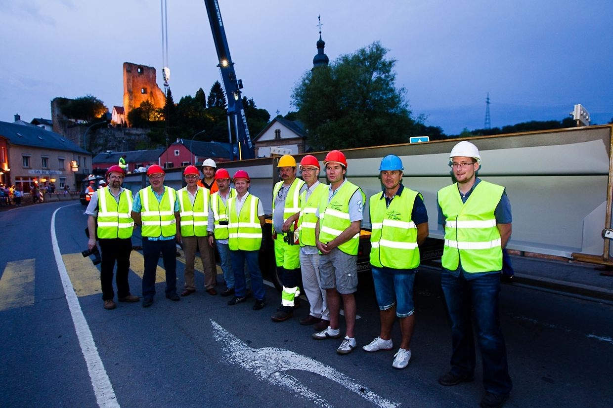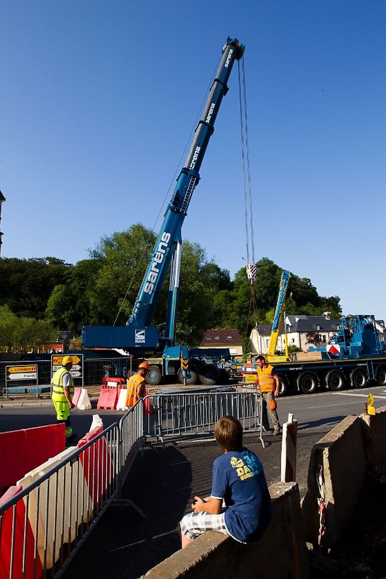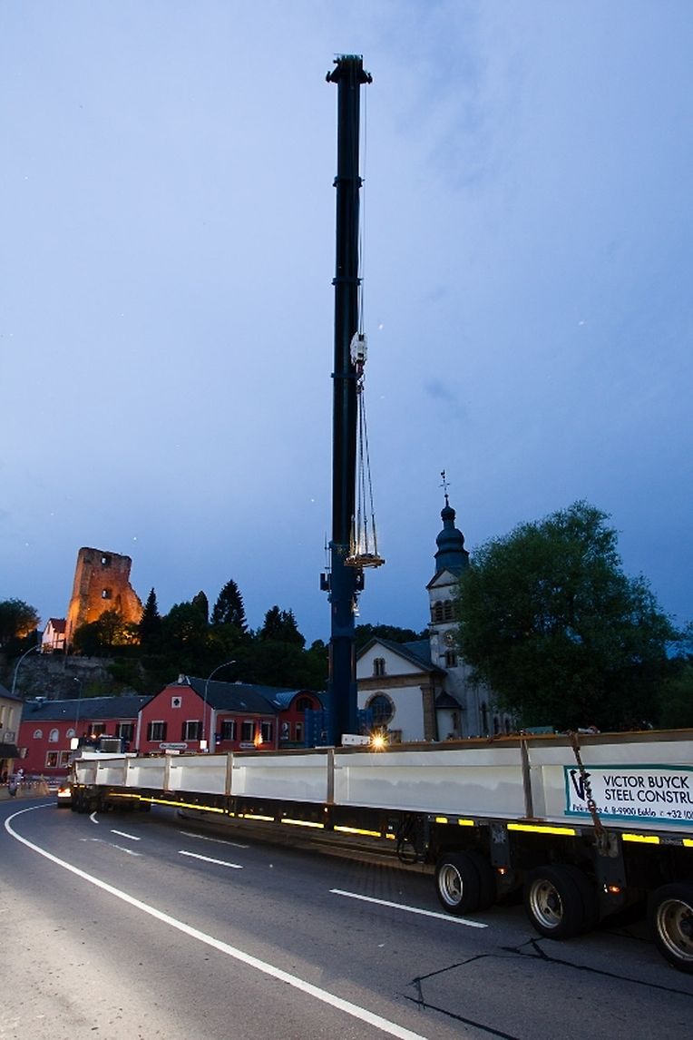 Den Eischten deel vun der neier Hesper Bréck ass gesat, iwwert Nuecht huet eng spezialiséiert Firma mat engem 700T Kraan di eenzel Elementer an Positioun bruecht. een Element hat ee Gewiicht vun ëmmerhin 40T.