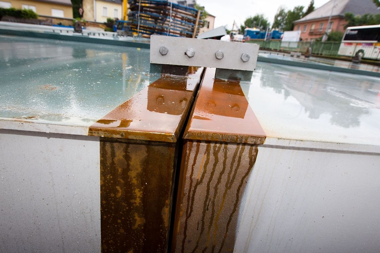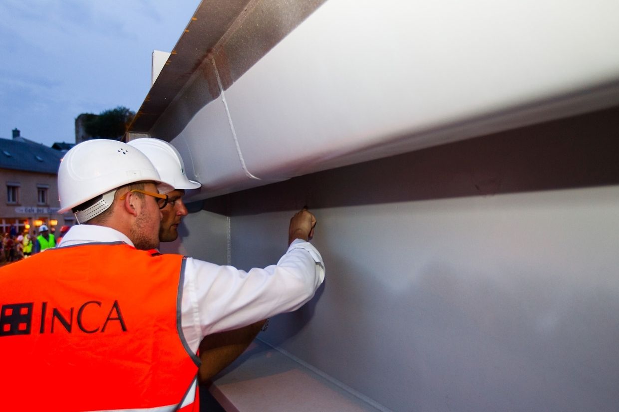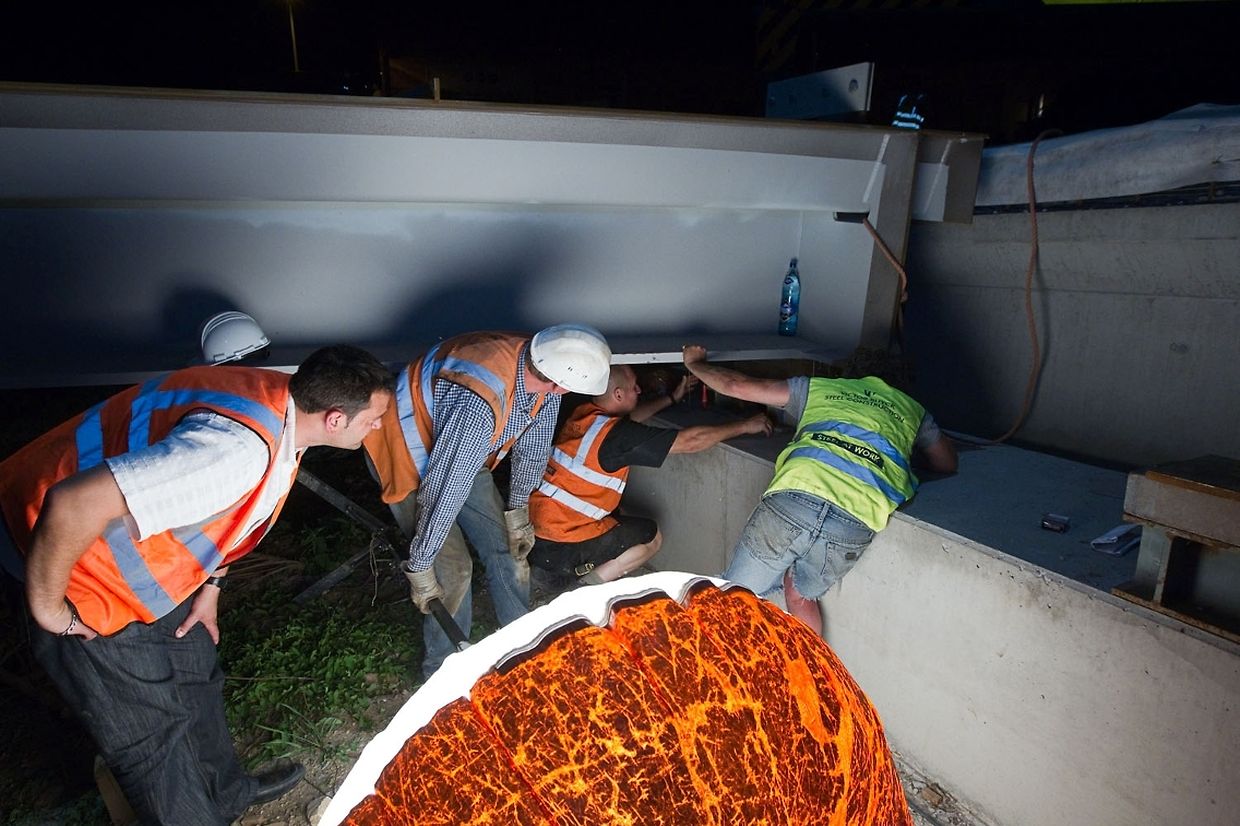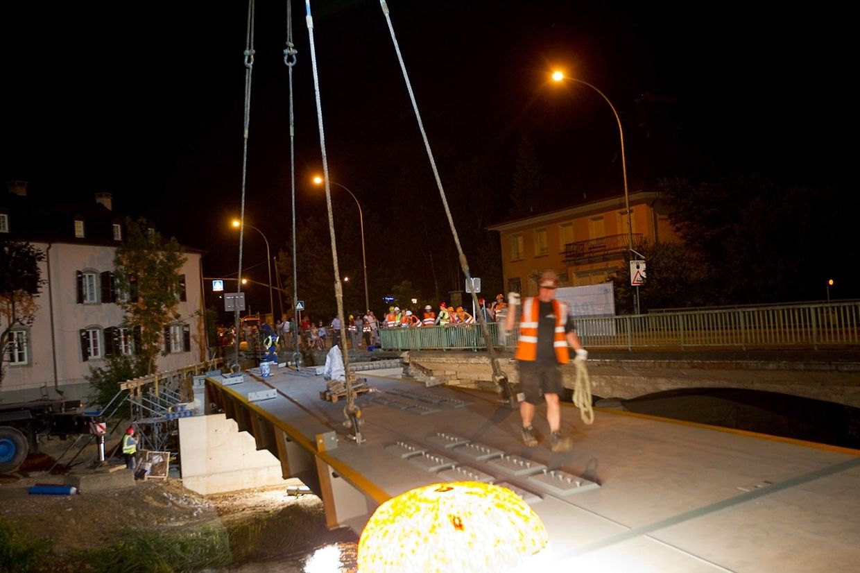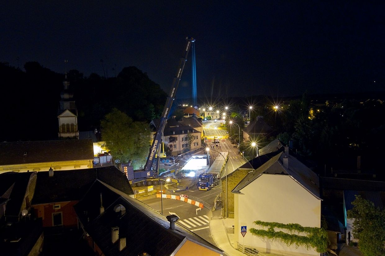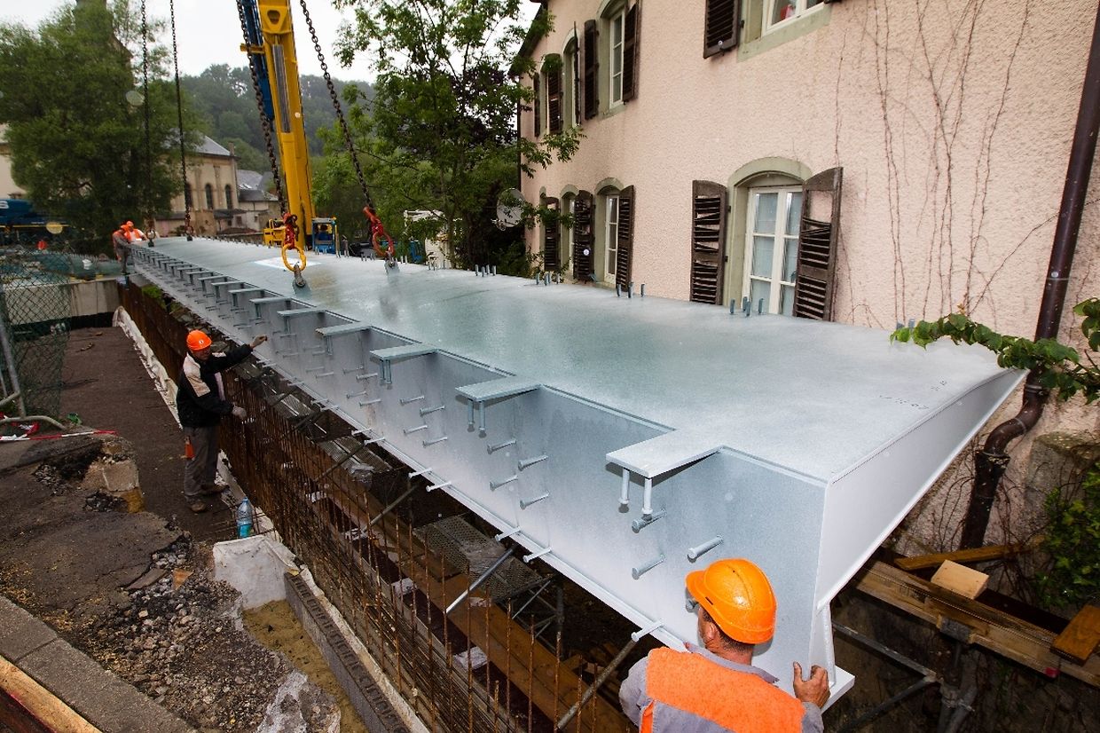 Den Eischten deel vun der neier Hesper Bréck ass gesat, iwwert Nuecht huet eng spezialiséiert Firma mat engem 700T Kraan di eenzel Elementer an Positioun bruecht. een Element hat ee Gewiicht vun ëmmerhin 40T.