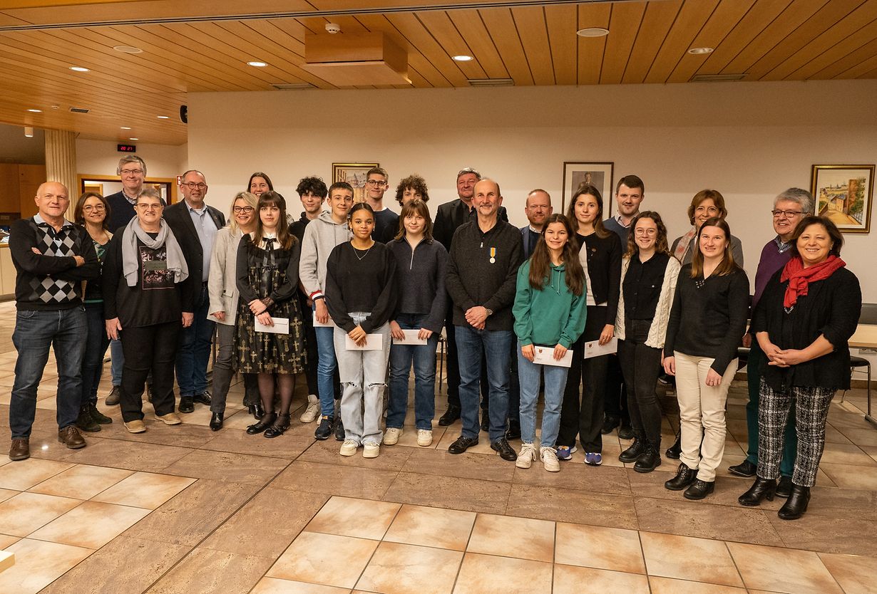 Anschließend ehrte UGDA-Vertreterin Angèle Michels-Unsen verdienstvolle Mitglieder. Das Insigne für 5 Jahre Mitgliedschaft erhielten Gaspard Bouchard und Etienne Bailleul. Die Médaille de mérite en bronze ging an Mia Kieffer, Marie Lorgé und Ludwig Eser Simoes. Die Médaille en argent Grand-Duc Adolphe ging an Domenico Mirizzi und an Marc Mersch. Seitens der Harmonie wurden Marie Faber Haagen (Saxophon), Louis Faber Haagen (Trompete), Felix Lorgé (Trompete), Marie Lorgé (Saxophon), Celia Masala (Saxophon), Aubanne Rousseau (Querflöte), Jil Schmit (Saxophon und Klavier) sowie Victor Vautrin (Trompete) ausgezeichnet.