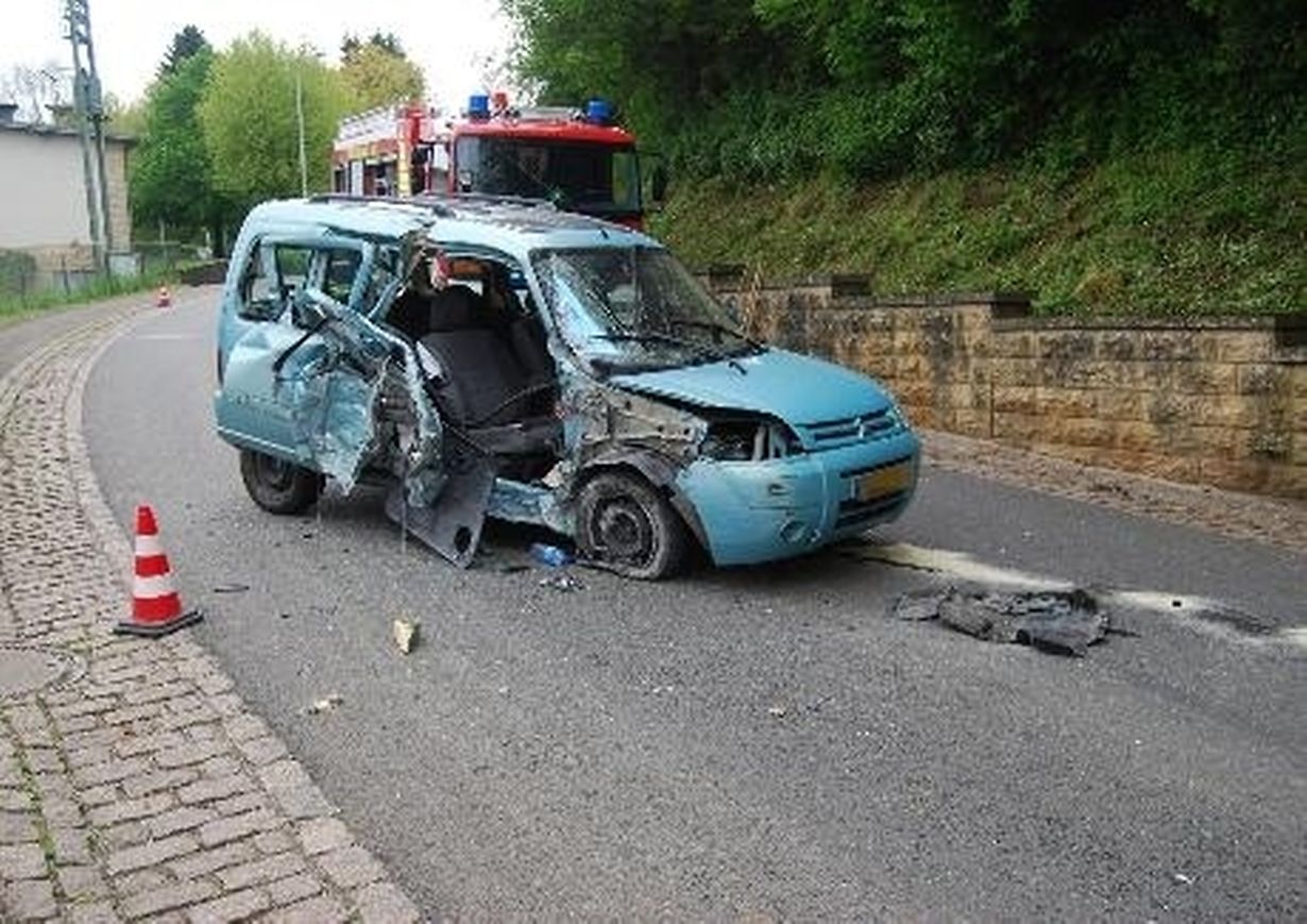 Aus noch ungeklärten Umständen war der Fahrer in der Rue de Garnich mit der rechten Fahrzeugseite gegen eine Straßenmauer geraten, so dass die Seite seines Fahrzeugs aufgerissen wurde. Sein Beifahrer wurde dabei leicht verletzt und musste ins Krankenhaus, dem Fahrer geschah nichts.