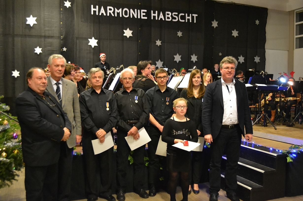 Im Verlauf des “Chrëschtconcert“ der Harmonie Hobscheid wurden verdienstvolle Mitglieder mit UGDA-Medaillen ausgezeichnet. Der Abend wurde musikalisch eingeleitet von der Jugendgruppe unter der Leitung von François GODARD. Danach wurde das Publikum gekonnt vom ganzen Orchester der Harmonie durch Weihnachtsmelodien in festliche Stimmung versetzt. Herr Robert WEYLAND, als Vertreter der UGDA verlieh die Auszeichnungen . Eine “Insigne de Mérite“ ging an LECLERC Lena, eine Bronzemedaille an CARELLI Benny, eine Silbermedaille jeweils an DE MICHELE Jil und an ESPEN Pierre während POPOV Roland mit der Silbermedaille “Grand-Duc Adolphe“ geehrt wurde.