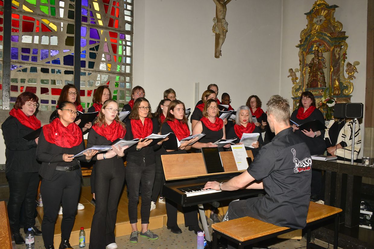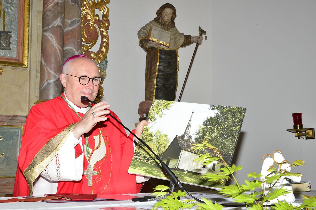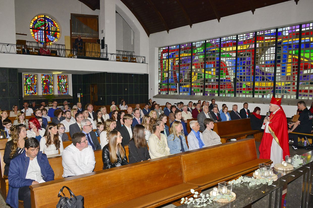 Mit dem Lied "Feuer und Flamme" eröffnet der Jugendchor Adesso die Firmungsmesse. In seiner Predigt über den Heiligen Geist greift Leo Wagener den Refrain des Zwischengesanges von Timo Langner auf "Heiliger Geist, leite die Zeit, zeig uns den Weg, führ uns zum Thron, Geist Gottes komm, wir brauchen mehr von dir - hier." Dann erklärt er den Firmlingen die Früchte des Heiligen Geistes. Die 9 Firmlinge empfangen das Sakrament der Firmung und werden dabei von ihrem Firmpaten oder -patin begleitet. Als Dank überreichen die Firmlinge dem Bischof ein Bild von der Klaus von Hachiville, deren 550 jähriges Jubiläum dieses Jahr in der Pfarrei gefeiert wird.