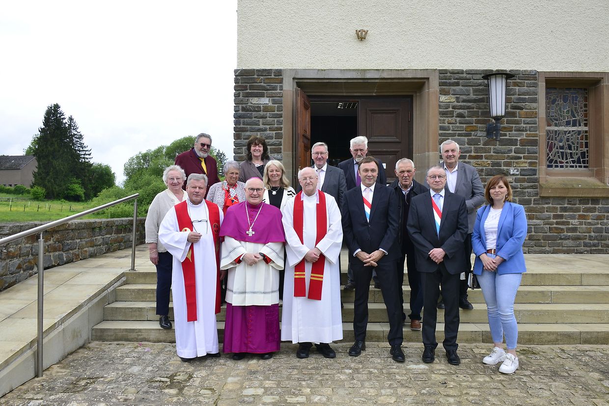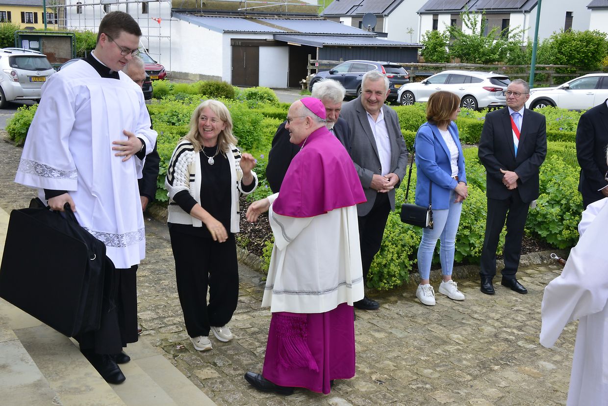 Vor der Pfarrkirche in Hoffelt wurde Weihbischof Leo Wagener herzlich empfangen von dem Pastoral- und Vermögensverwaltungsrat der Pfarrei und von Bürgermeister Luss Meyers mit den Vertretern des Schöffen- und Gemeinderates. Denise Schickes, Präsidentin der Pfarre Wintger begrüsst den Weihbischof in der Kirche mit Blumen.
