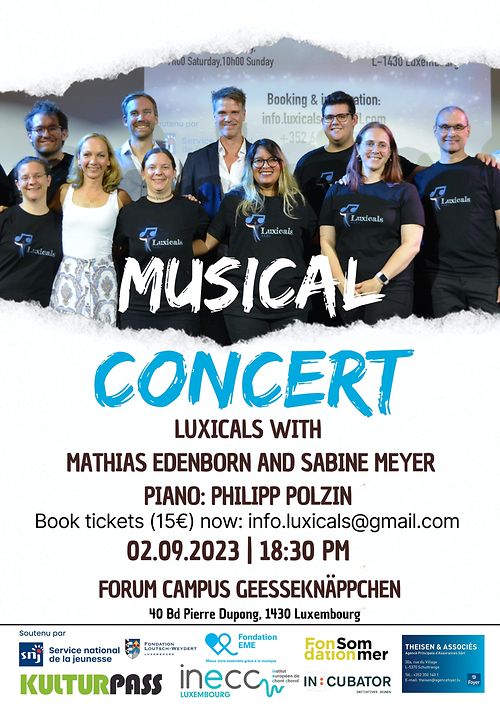 Mir hunn als Luxicals a.s.b.l. hunn een Musical Concert den 02.09.2023 um 18:30 am Forum Geeseknäppchen. Mat dobäi sinn déi bekannten Musical Sänger an Duersteller Mathias Edenborn, Sabine Meyer an um Piano den bekannten Musical Komponist Philipp Polzin.