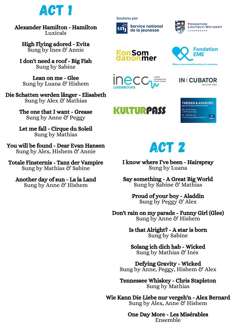 Den Concert, ass Deel vun eisem Musical Workshop vum 1-3 September 2023. Wou mir jonken aus Lëtzebuerg d'Méiglechkeet gi, een Abléck an d'Beruffsliewen vun engem Musical Duersteller ze kréien, an hier kreative Kompetenzen ze entfalen.