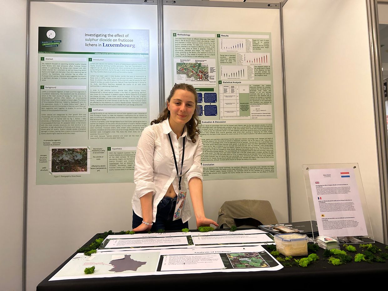 C’est Illona Dausse (19 ans), ancienne élève de l’International School Luxembourg (ISL), qui défendit fièrement les couleurs du Luxembourg, sous l’égide de la Fondation Jeunes Scientifiques Luxembourg (FJSL), avec un projet de recherche en science environnementale. Cette chercheuse en herbe, qui est désormais étudiante en bachelor de développement durable à l’Université de Leyden, avait eu l’idée de démontrer l’impact environnemental d’un complexe industriel et routier, du côté de Steinfort, en utilisant comme indicateur de pollution la croissance de deux variétés de lichens dit « fruticuleux » (https://www.youtube.com/watch?v=5ymtqyY_ftw). Ces derniers sont en effet connus pour être très sensibles à la concentration de dioxyde de soufre (SO2) dans l’air, leur principale nourriture.