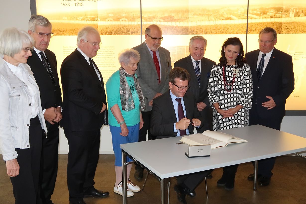 Botschafter Jean Graff trägt sich bei der zentralen Erinnerungsfeier in das Goldene Buch der Gedenkstätte Esterwegen ein. (Foto: Jean Ferber)
