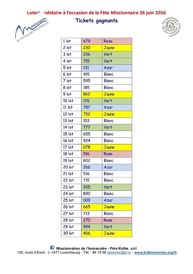 Nous félicitons ceux qui ont gagnés la Loterie (ci-contre la liste), avec les mots d’un participant: « Nous avons tous gagné, car on gagne l’amour que l’on donne aux pauvres »