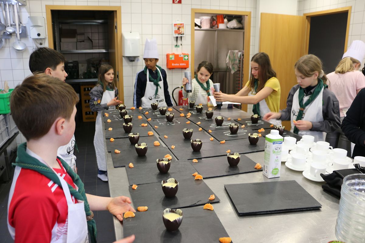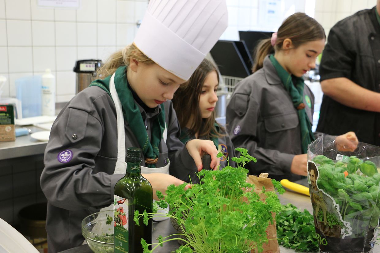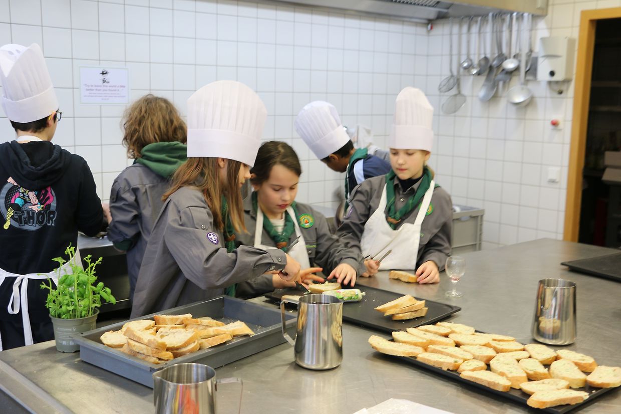 Den Rëscht vum Weekend stoung komplett am Thema Kachen. Um Programm stoungen Reegelen vun der Hygien, d’Erklären vun dem Kichenmaterial, Opbauen vun enger Spullstross, an Kënnenleieren vun villen Kraider a Gewierzer.
