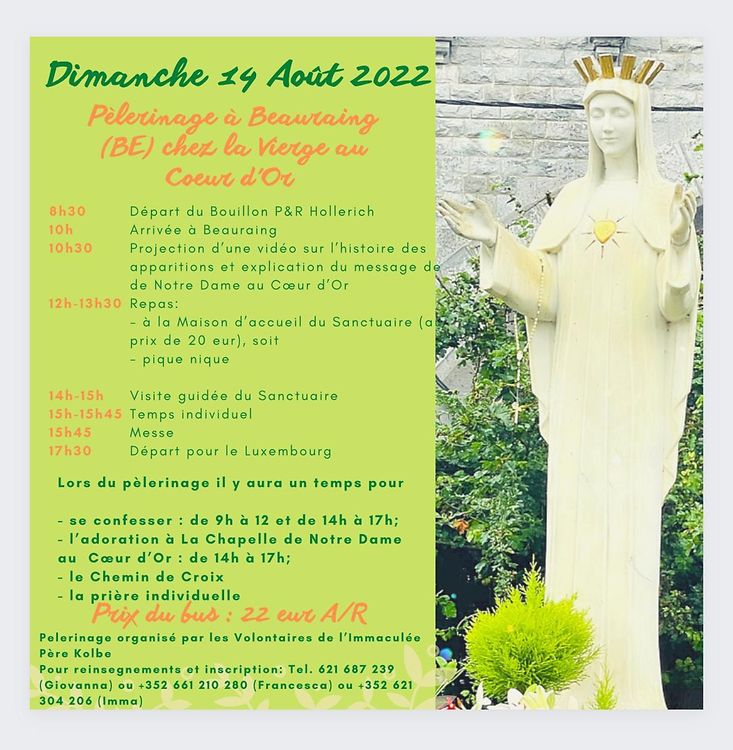 Luxemburg - Hollerich Pèlerinage à Beauraing (Belgique) Enrichetta Petteruti Veröffentlicht am Donnerstag, 4. August 2022 um 11:22 Bouillon, 61 Rue de Bouillon, 1248 Luxemburg, Luxembourg INVITATION Pèlerinage à Beauraing organisé le 14 aout, jour où l'Eglise fait mémoire du martyre de St Maximilien Kolbe. Unpassenden Inhalt angeben Weitere Neuigkeiten von Enrichetta Petteruti > Veillé de la Pentecôte 2022 02.06.22 Luxemburg - Hamm 100 ans de vie et d’histoire de la Mission de l’Immaculée (M.I.) 17.10.17 Luxemburg - Hollerich Le secret de saint Maximilien Kolbe 16.10.17 Luxemburg - Hollerich L'amour n'a pas d'horizons 05.07.17 Luxemburg - Hollerich Deux Pèlerinages: à FATIMA et à ROME 19.05.17 Luxemburg - Hollerich
