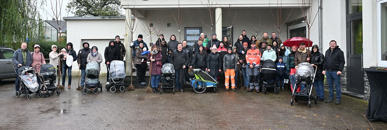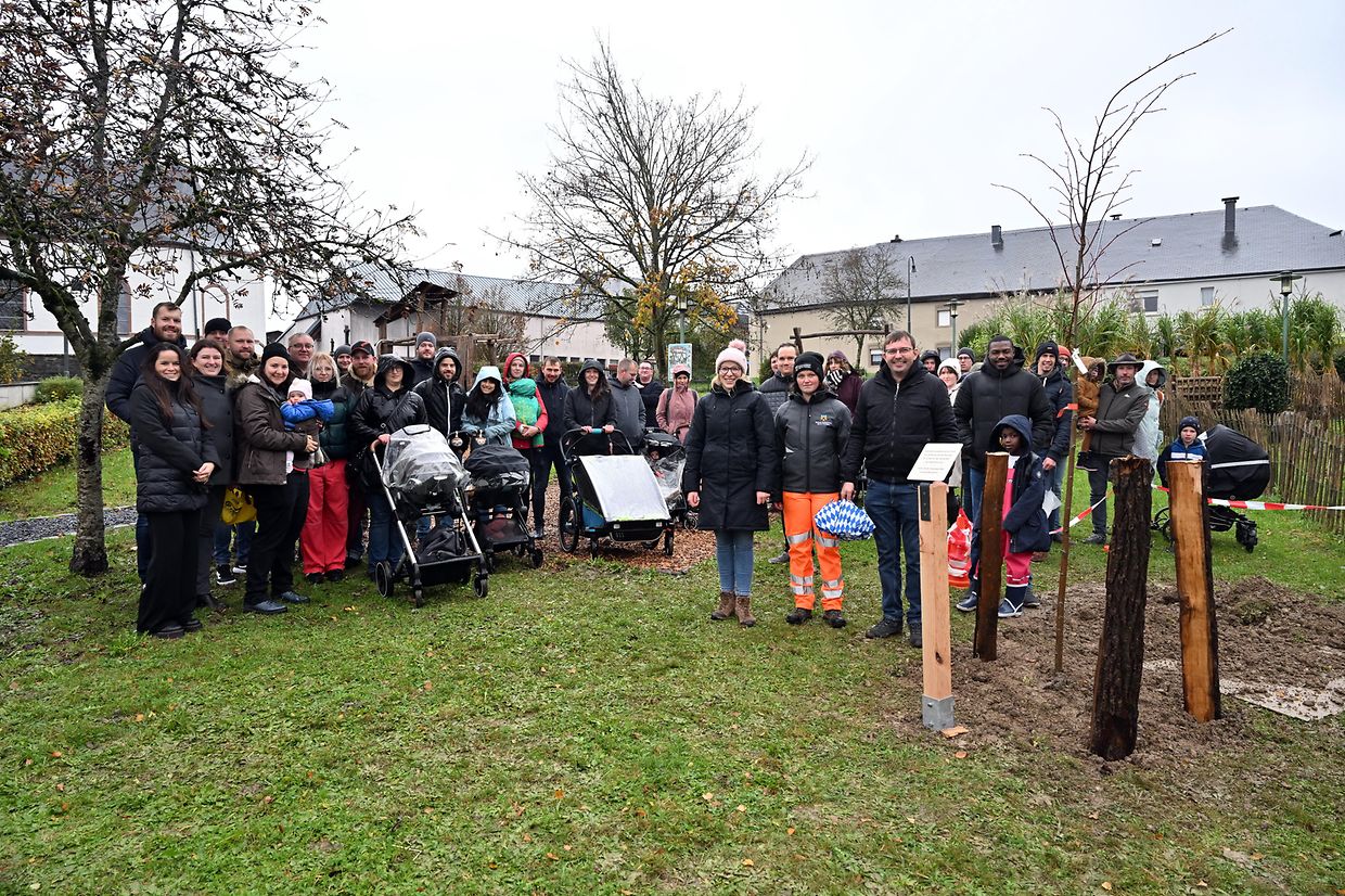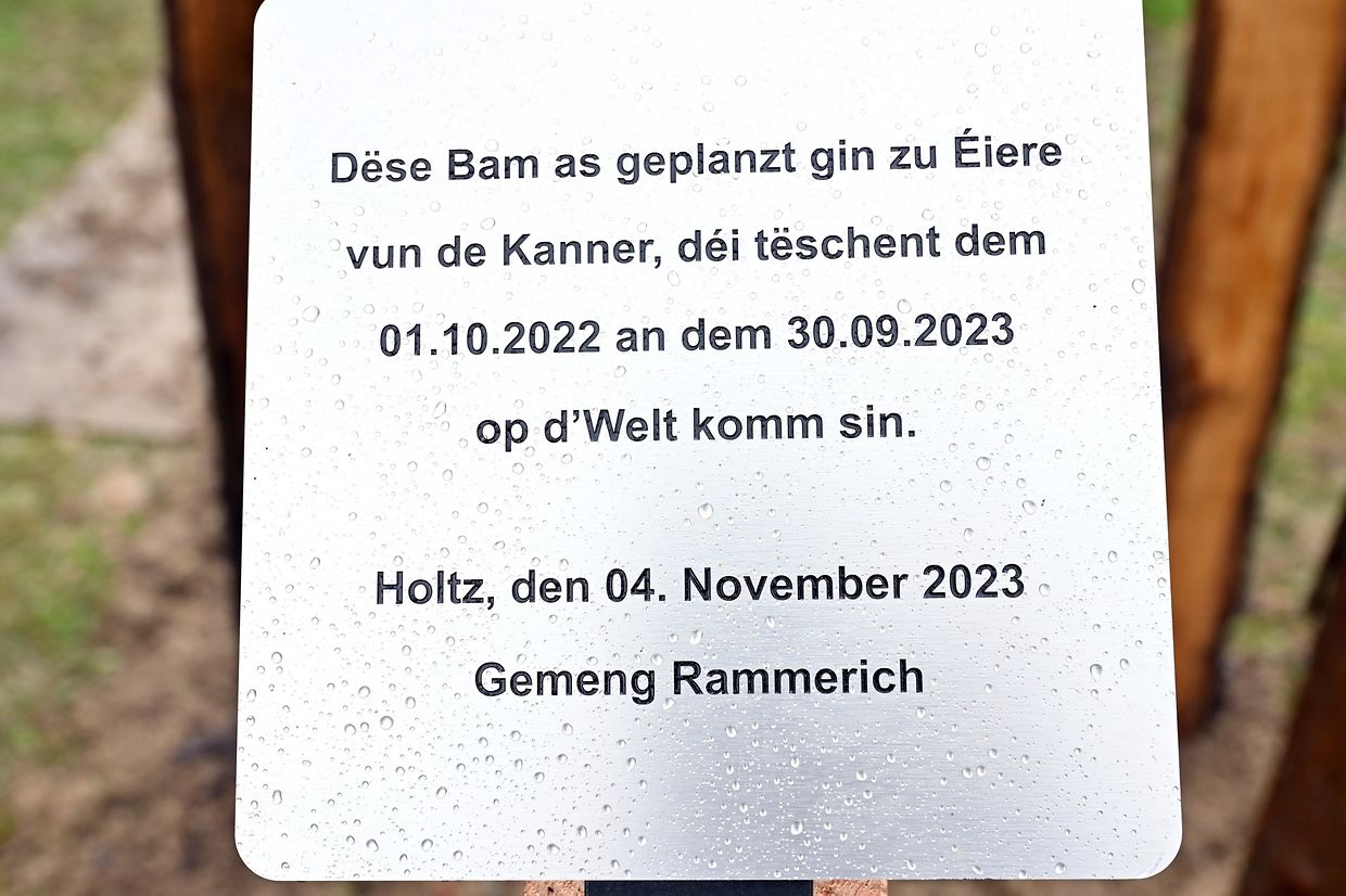 Houltz: Am Kader vum Dag vum Bam an am Verlaaf vun enger klenger Feier beim Festsall zu Houltz, hun ronn 20 Kanner di tëschent dem 1. Oktober 2022 an dem 30. September 2023 op d’Welt komm sin, mat hiren Elteren, e Bam no hirer Wiel vun der Gemengeverwaltung Rammerich, geschenkt kritt. Wi d‘Myriam Binck, als Buergermeeschter agaangs vun deser Feier vermierkt huet, sin ganz vill Bräicher mat der Gebuert vun engem Kand verbonnen, wou en vun denen ass planzen vun engem Bam als Zeechen vun engem neie Liewen duerstellt. Wonnerbar ass et ze gesin, wann de Bam am Fréijoer engt neit Kleed un deet an och Schutz a Schied mecht fir de Mënsch an Déier an eis duerno beschenkt mat gudde Friichten. An och am Hierscht wou hien Abschied hëllt mat engem schéinen Farwekleed souwi och am Wanter hällt hien de Stuerm an de Reen aus. Genee wi e Bam, brauch e Kand vill Léift, Gedold a Pfleg, an dat ass ent vun dene ville Rezepter. Et ass och immens interessant a schéin ze gesin, wi e Kand grad wi de Bam sech am Laaf vu sengem Liewen entwëckelt an och grouss gëtt. De Mount November ass bekanntlich den nationalen Dag vum Bam hei zu Lëtzebuerg. Duefir ass och am Virfeld vun deser Feier symbolisch fir all Kand an der Gemeng eng Lann op der Spillpatz zu Houltz zesummen mat de Kanner, Elteren, dem technischem Dingst vun der Gemeng an de Vertrieder vun der ANF geplanzt gin. Bei enger deftiger Zopp an engem Patt am Festsall huet dess schéi Feier och hiren würdigen Ofschloss fond. (CR (Fotoen: Charles Reiser)